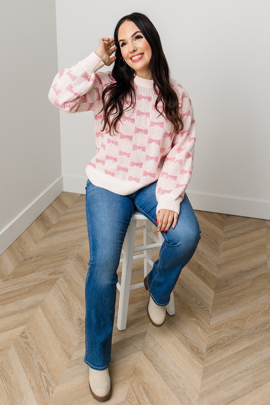 This sweater is adorable for the holidays! The bow print is festive without being over-the-top, which is exactly what I wanted. I'm wearing my usual size M, and it fits with a nice relaxed vibe. The knit is soft and great quality, so it’ll be my go-to sweater all season.
