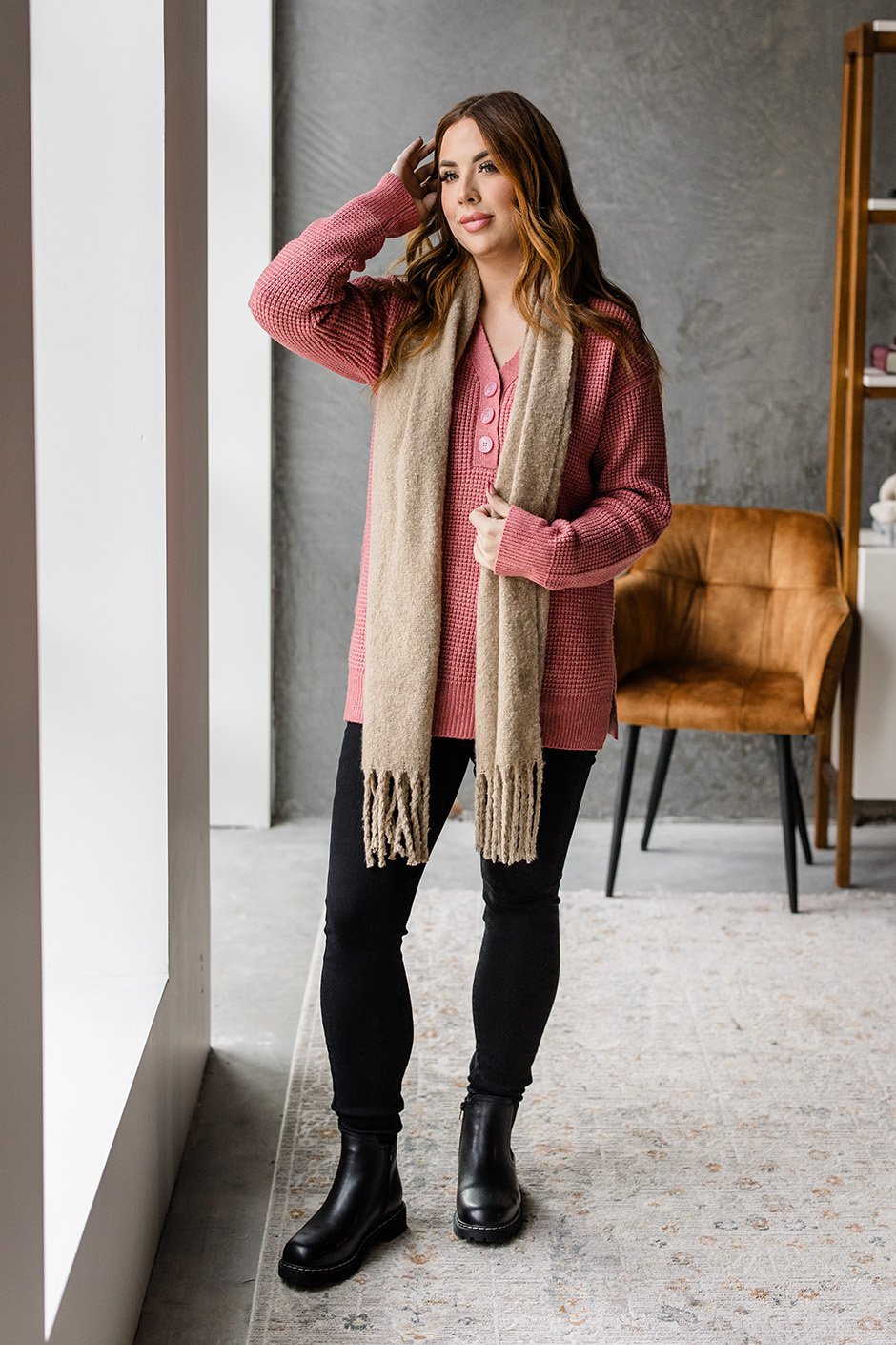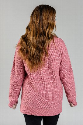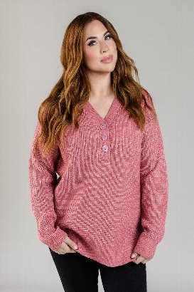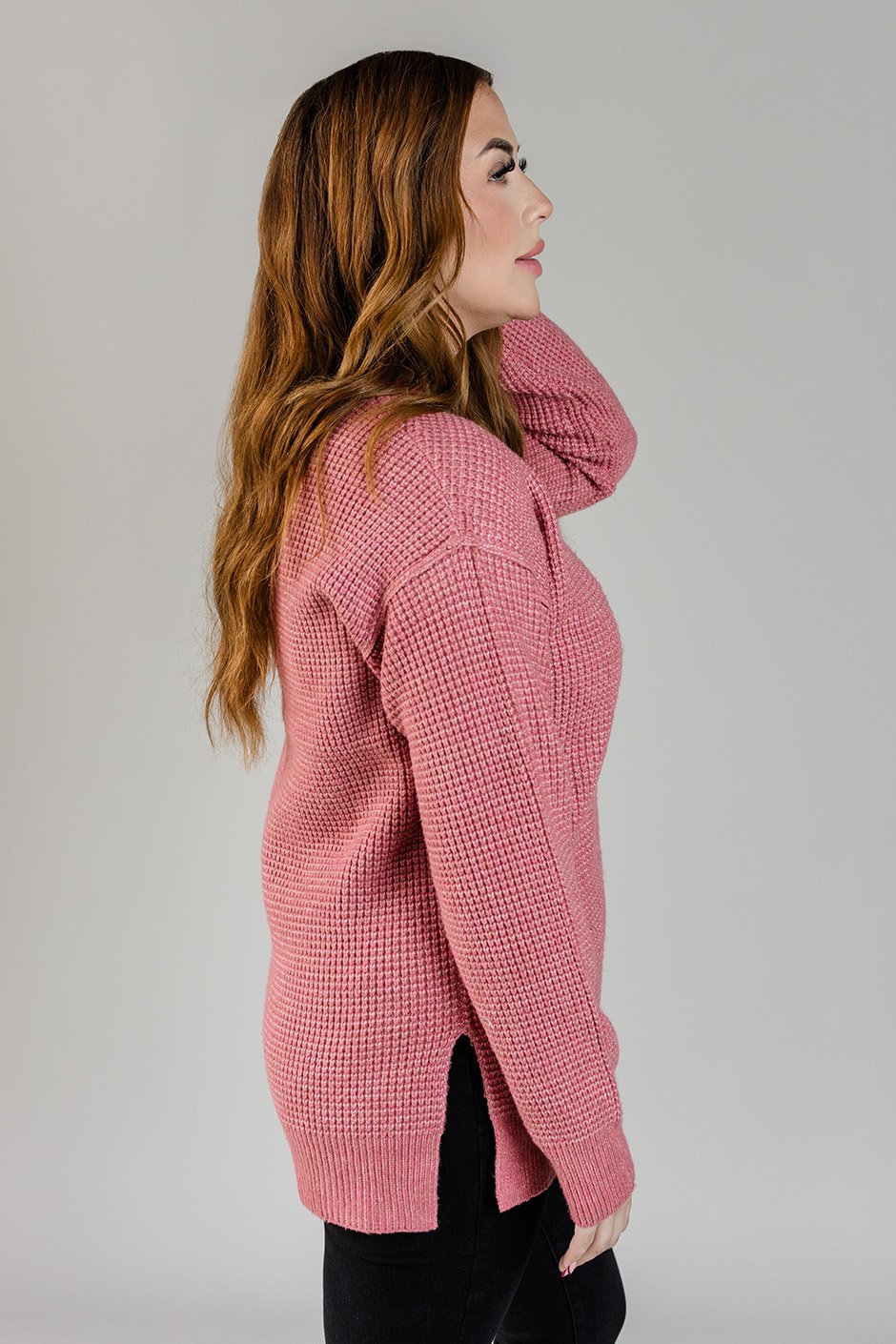 Wrap yourself in the essence of cozy with this chic waffle knit sweater. Featuring a stylish V-neck and a side slit, it brings a touch of elegance to your cold-weather wardrobe. The thick, comfy fabric keeps you snug, while the textured knit adds just the right amount of flair. Perfect for laid-back days or dressed-up moments, this sweater is the ultimate definition of cozy-chic.