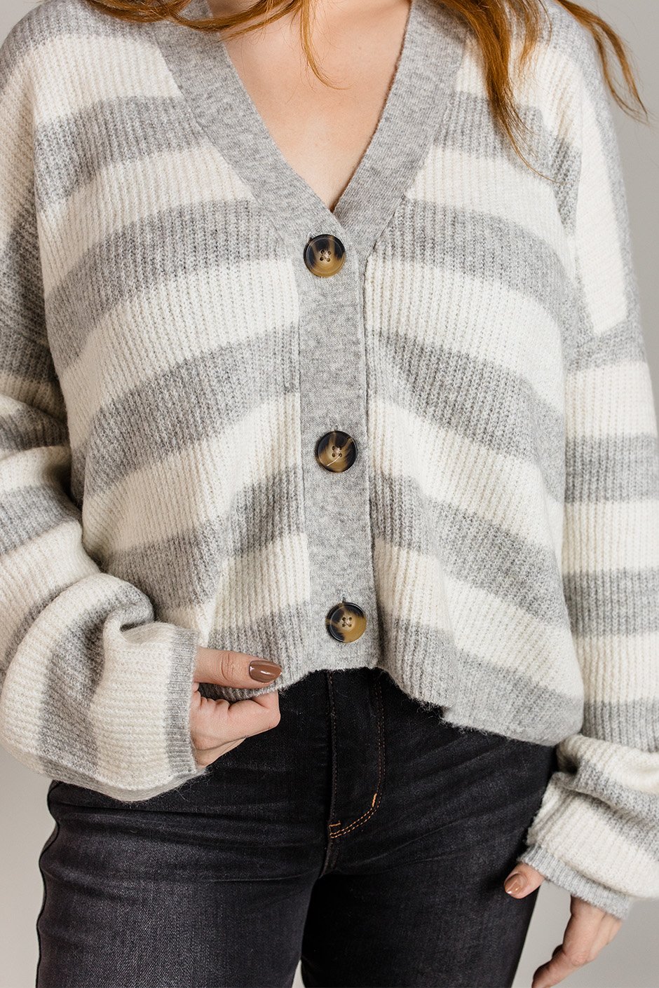 This striped cardigan is your new layering essential with soft rib knit that feels amazing against your skin. The classic button closure lets you style it open or closed depending on your mood. Throw it over everything from sundresses to basic tees.