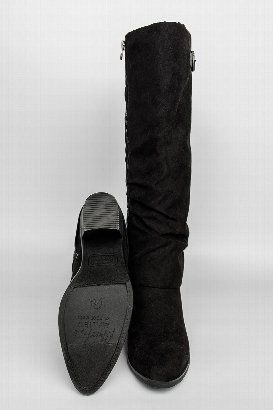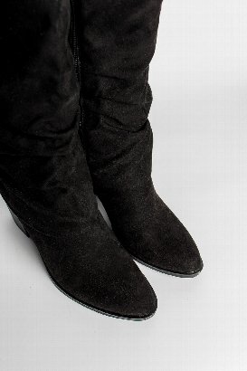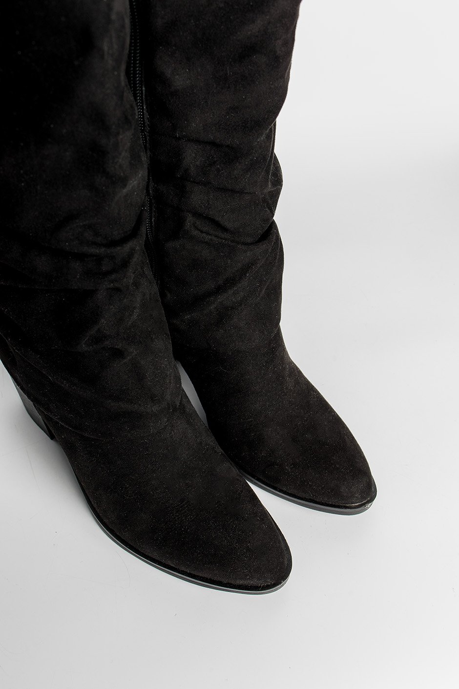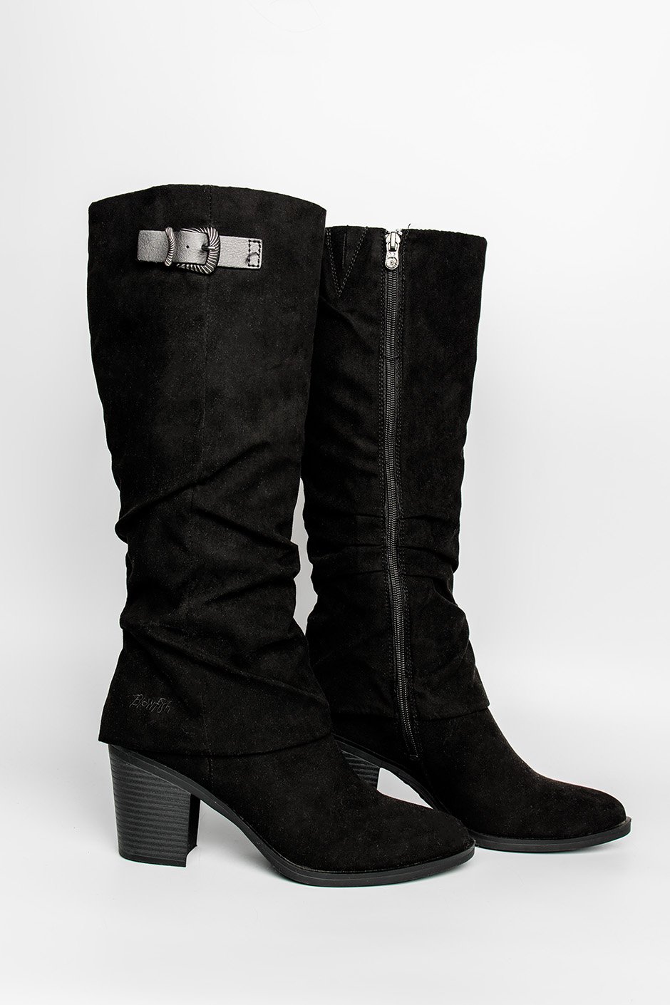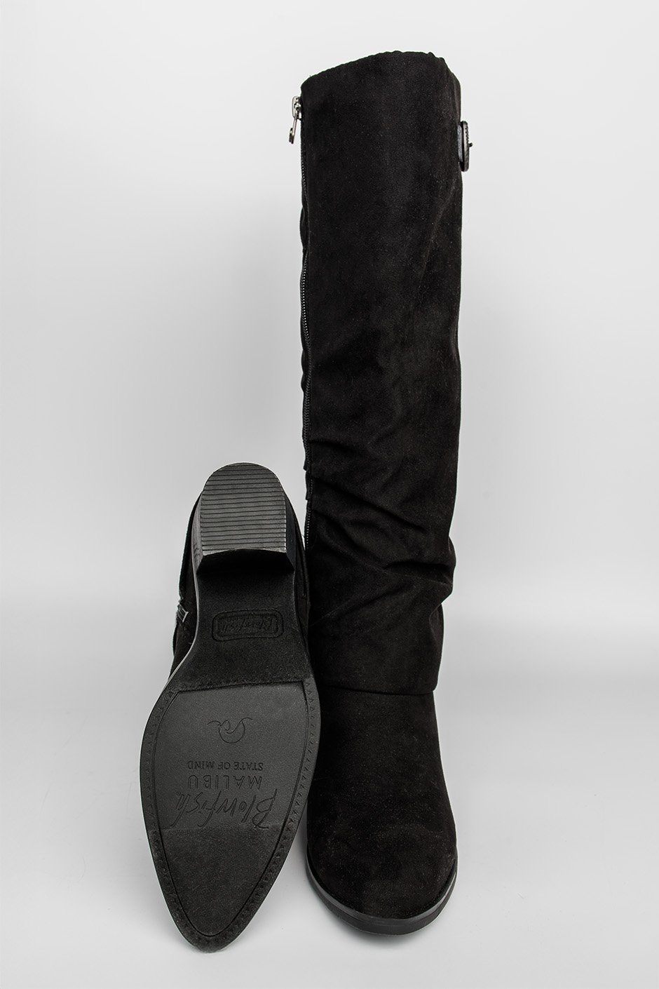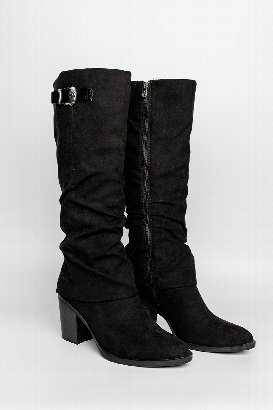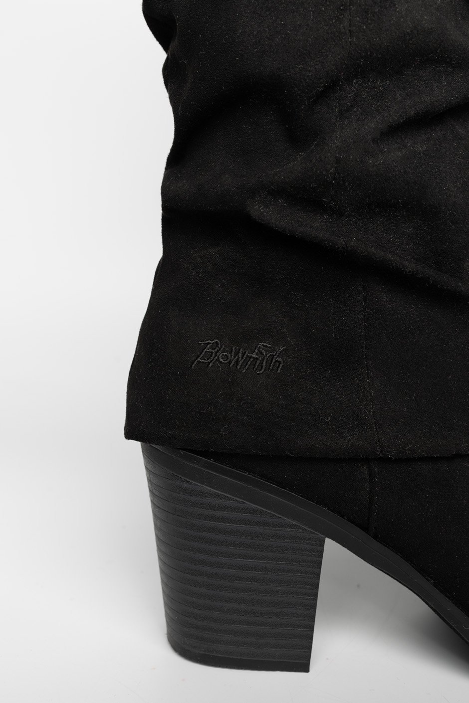 Blowfish always does a great job with their footwear. This boot is no exception. I love the matte suede finish and the premade slouchy look. The toe is pointed with an almond shape. The heel is not too high, and I feel very comfortable with the chunkier heel. Finally, the little buckle at the top is the perfect accent to top it off. I usually wear size 7.5/8, and I am wearing the sample size 8, which fits with a little bit of room in the foot and leg. There is some room in the leg, and there is also a little bit of gore at the top for some stretch.
