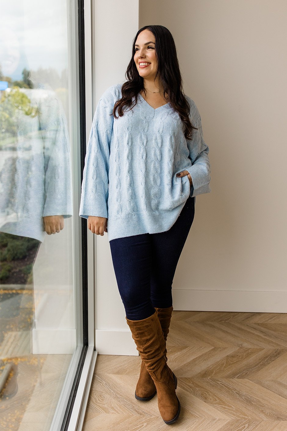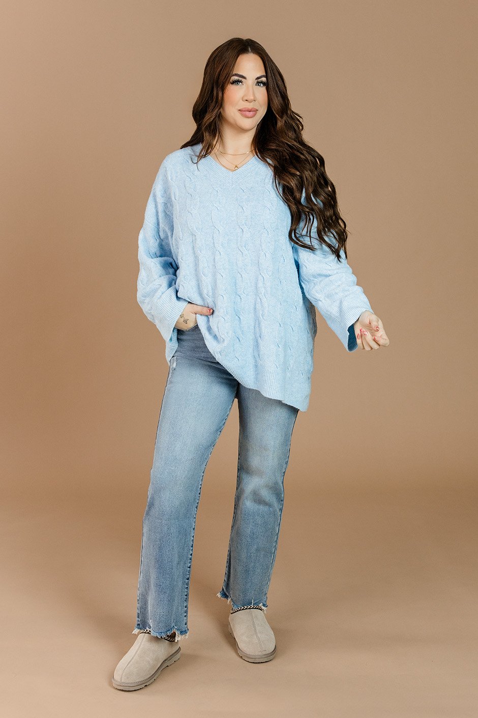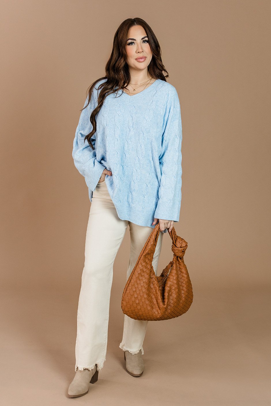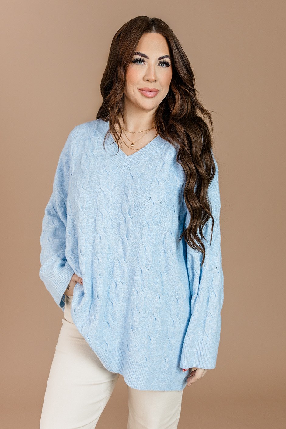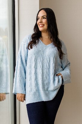 The Tinsley Cable Knit Sweater has an oversized fit and flattering V-neck that creates that perfect cozy-chic look. The stretchy material makes it comfortable enough to live in all season long. Wear it with leggings or jeans and add accessories for a more polished vibe.