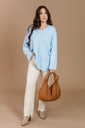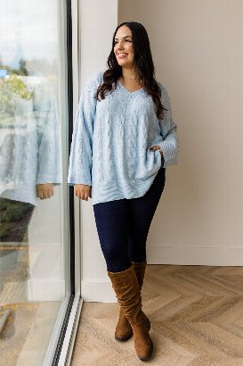 I’m in love with the color of this sweater; it’s such a pretty blue, and it's safe to say I'm obsessed with it. It’s probably the softest thing I've ever worn... like ever. I’m wearing a size large and the fit is perfect, relaxed but not too oversized. This one’s an instant favorite in my closet!