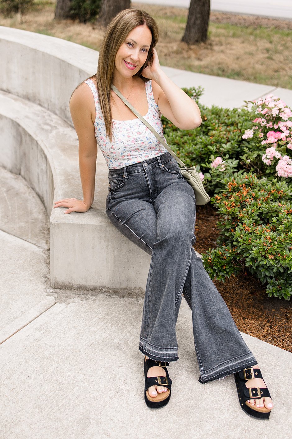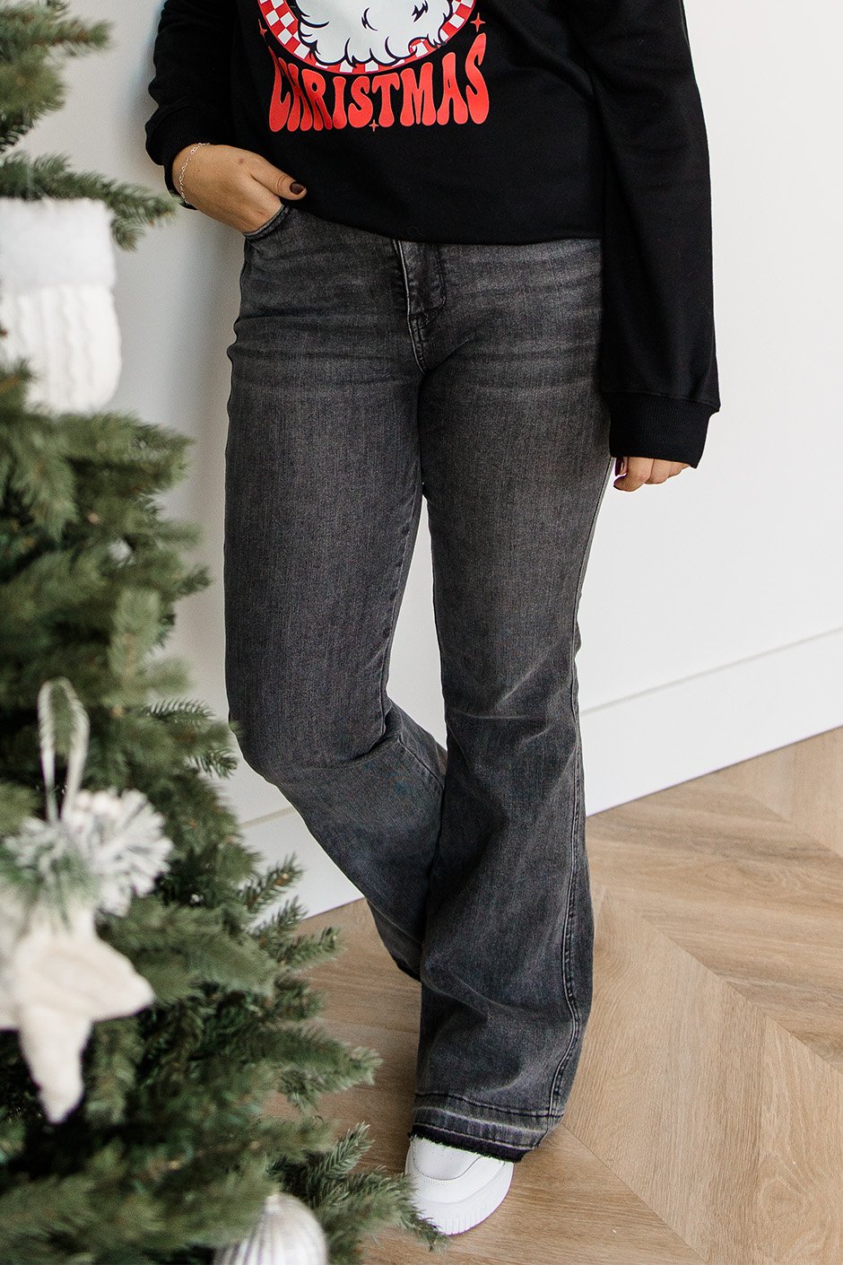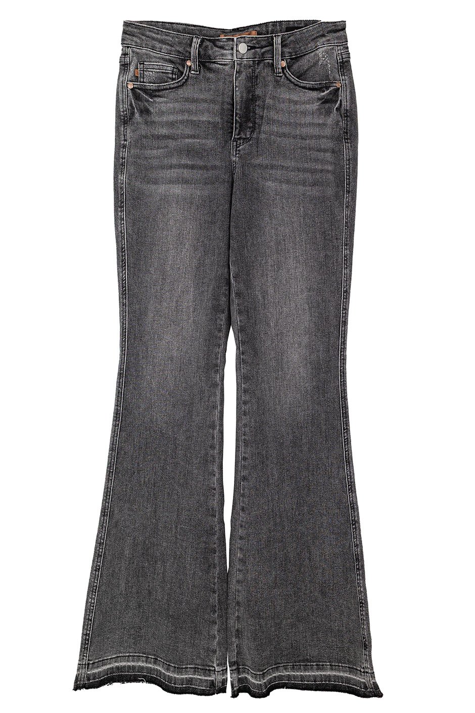 These washed grey jeans are made with stretchy fabric and tummy control that smooths without feeling tight. The flare leg nails the retro vibe and helps lengthen your silhouette. The released hem is made for wedges or boots that slide out and add just the right finishing detail.