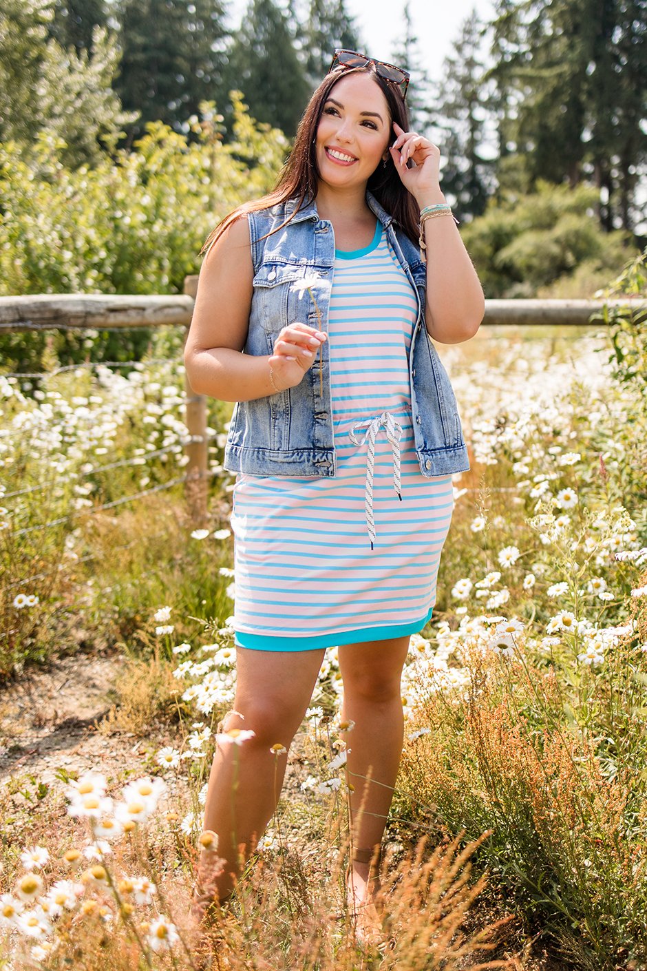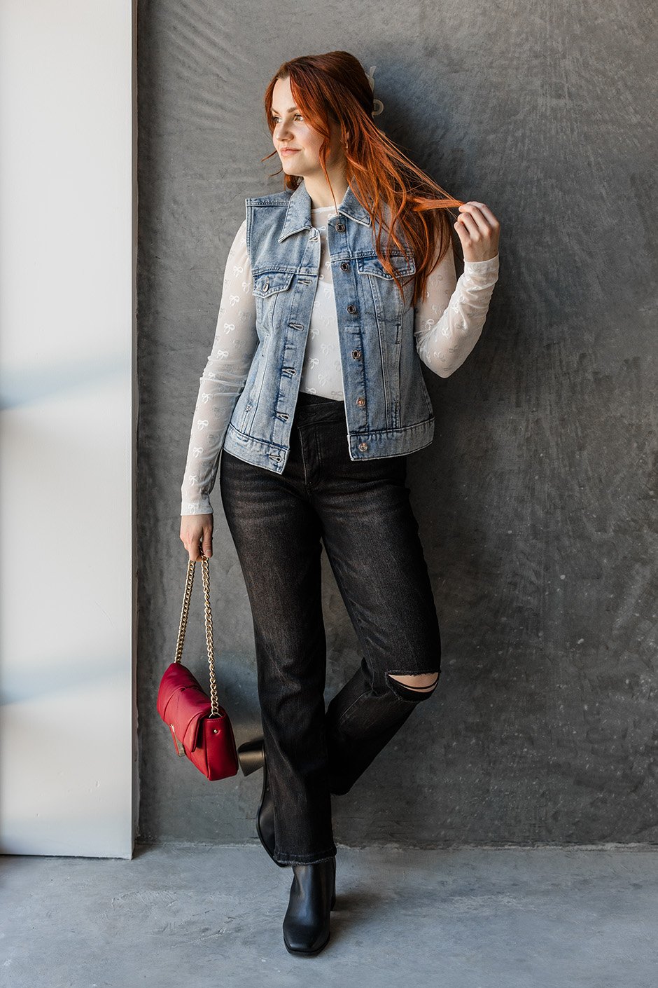 Jolene, you can take my man but NOT my Jolene Denim Vest! This vest is such a stylish addition to any outfit! Perfect for layering through any season. I love the thick, quality denim. It is very structured with a bit of give. I am wearing my true size small and that's the size I would order!