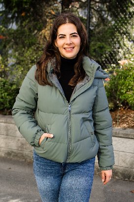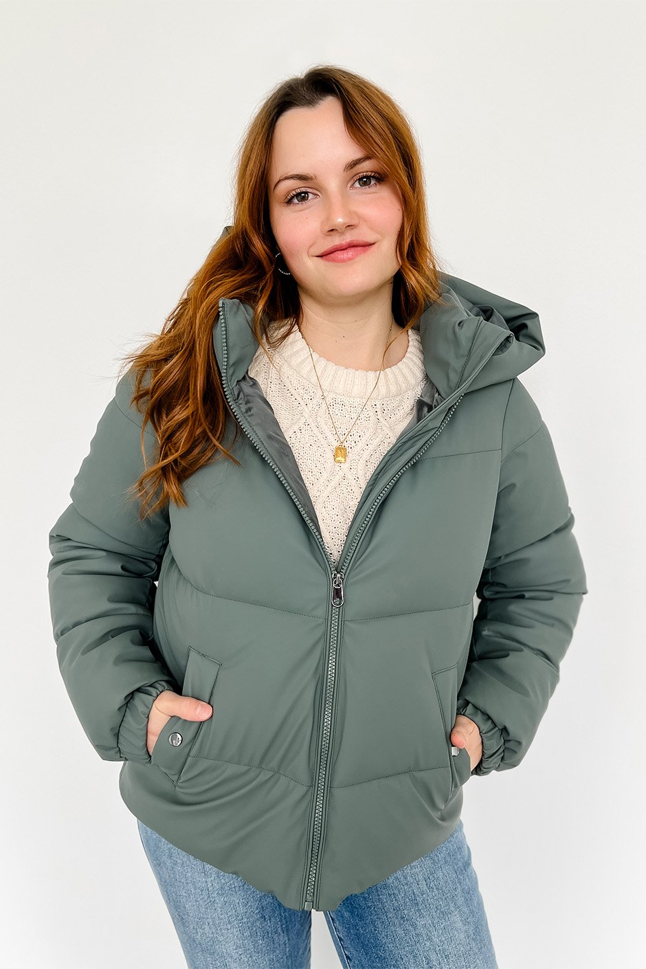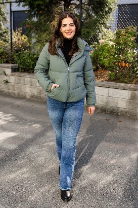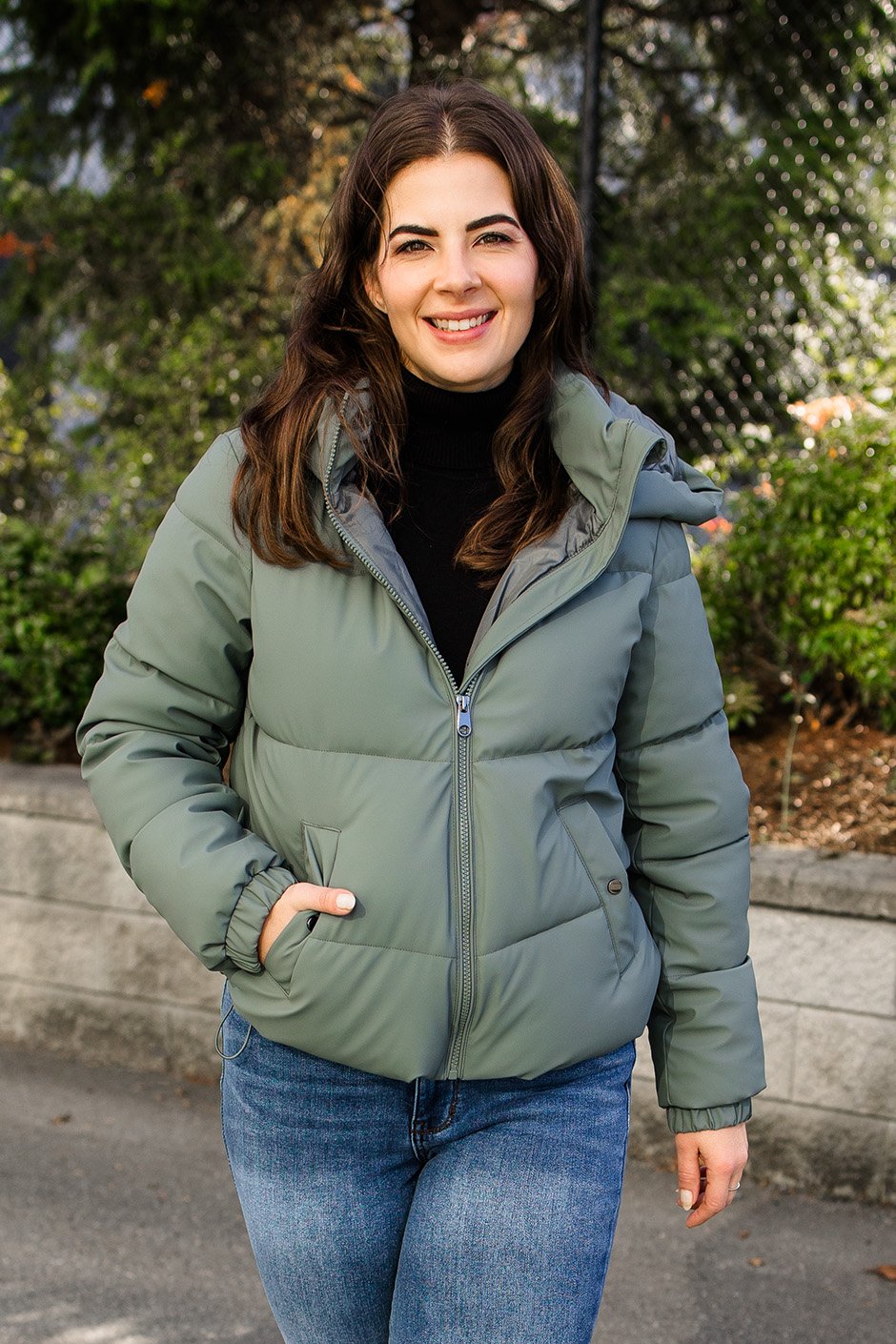 I wore this jacket in a size Small and found it fits true to size, super comfortable and cozy! The inner cinches are such a clever feature, they give the jacket more of a shaped bomber look if that’s your style, which I personally love. Even with the puffer design, it still feels flattering and not overwhelming on the frame. The colours are absolutely gorgeous, and the coated fabric feels really durable and slightly water-repellent, great for chilly, damp days or some light rain. I also really appreciate the cozy touches like the puffy hood and elastic cuffs. The snap pockets are super handy too. Overall, I love!