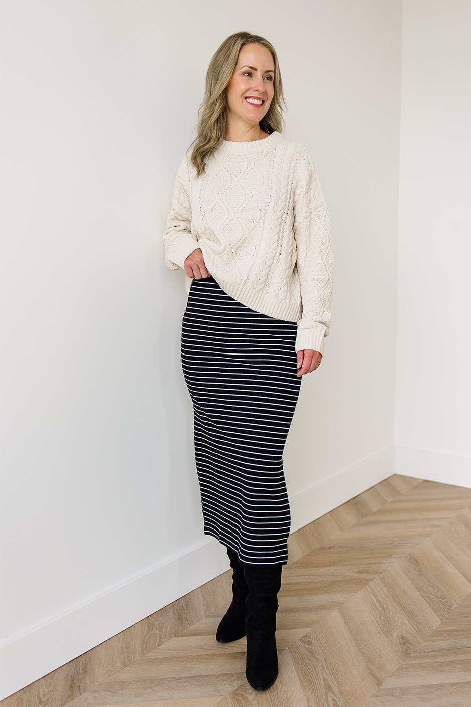 This skirt is unbelievably soft and so stretchy! Super comfy! I love how it fits; the striped pattern is flattering, and the midi length hugs my curves in all the right places. I’m wearing an XL and it fits perfectly! This is definitely the size I’d order. I feel amazing in it!