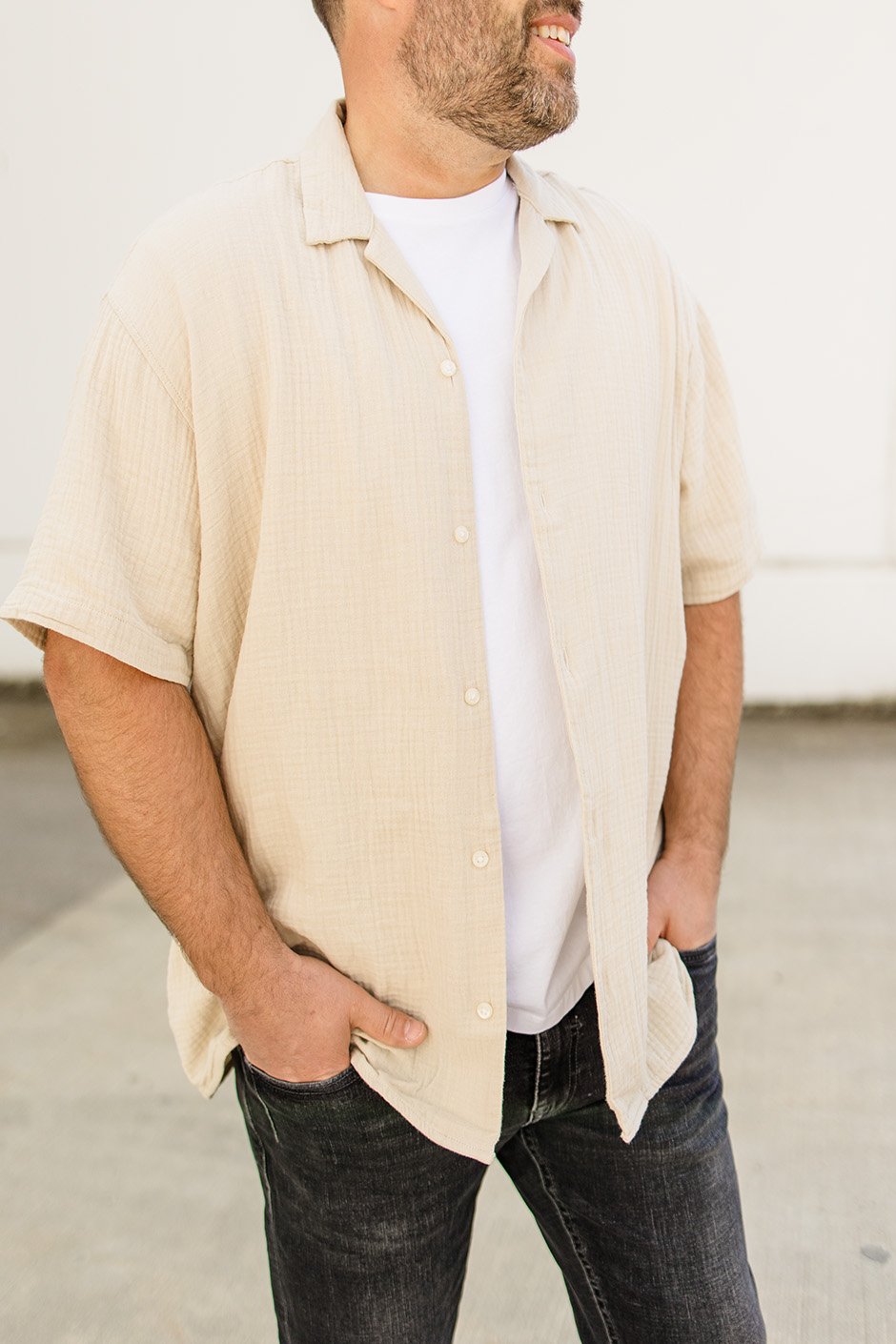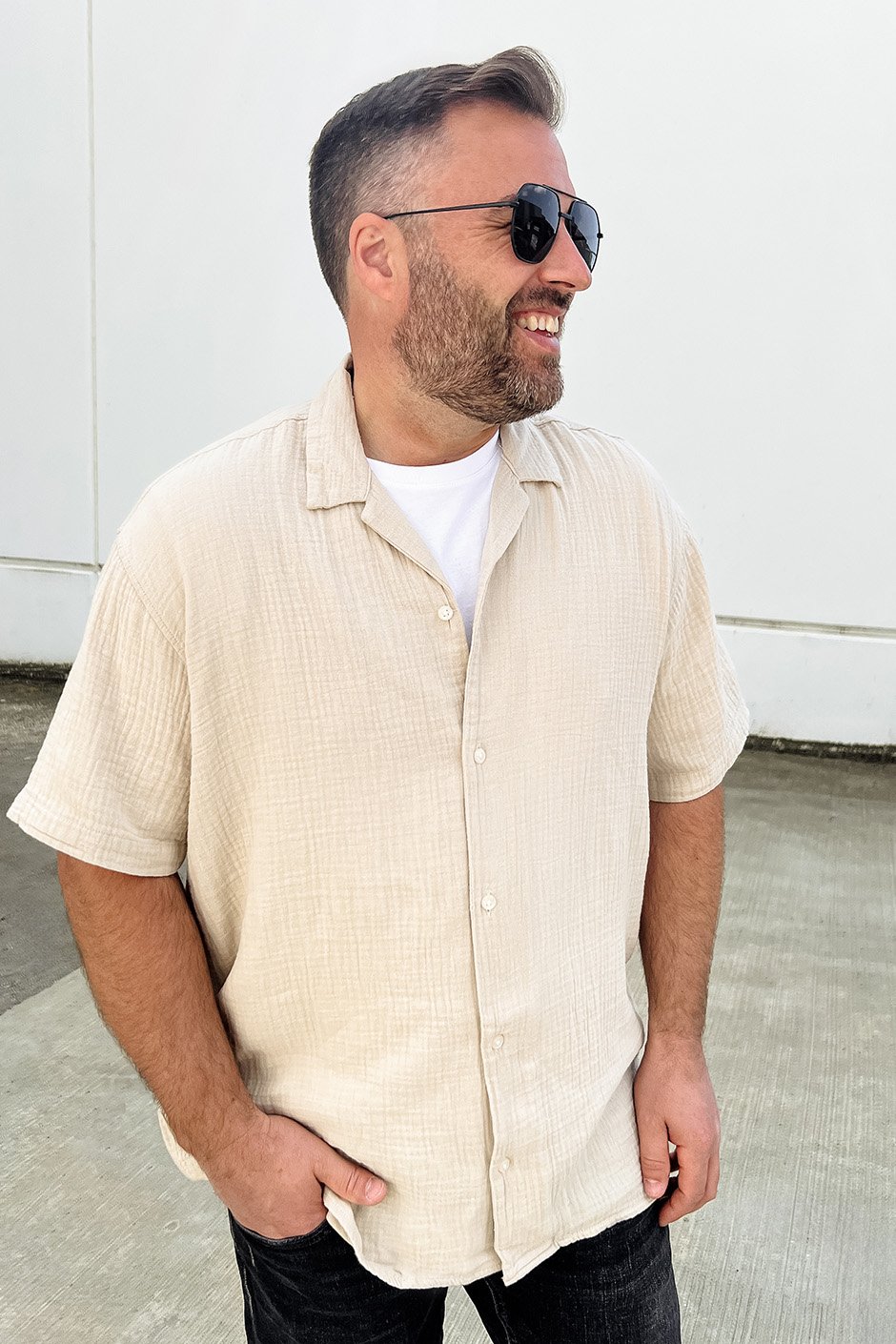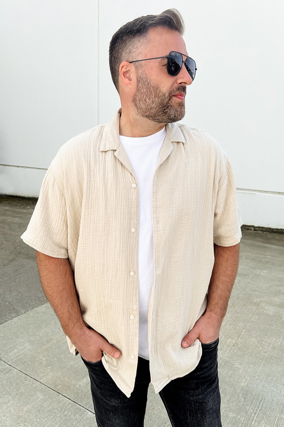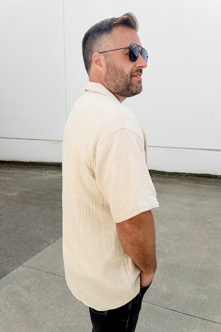Stay cool and stylish with the Men's Coastal Break Shirt. Featuring a classic lapel collar and easy button closure, this shirt is made from 100% breathable cotton—perfect for laid-back days by the water or casual outings in the sun.
