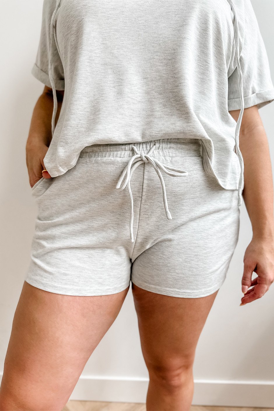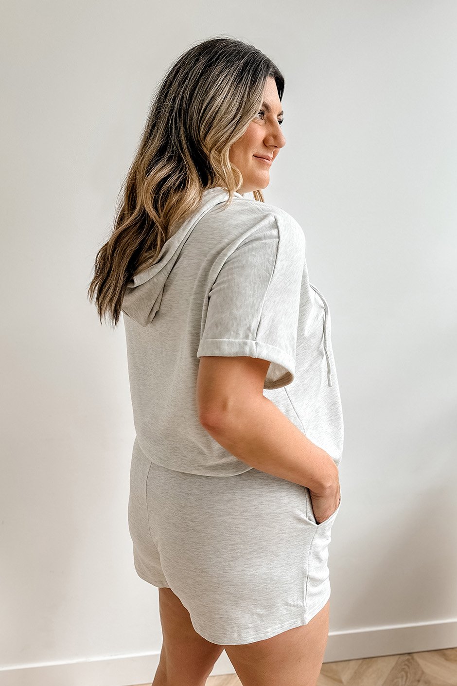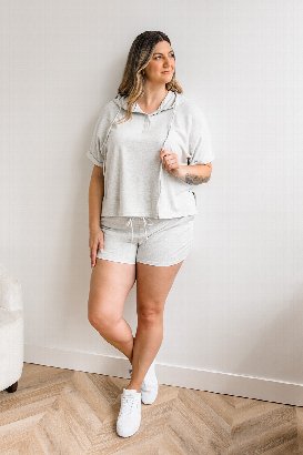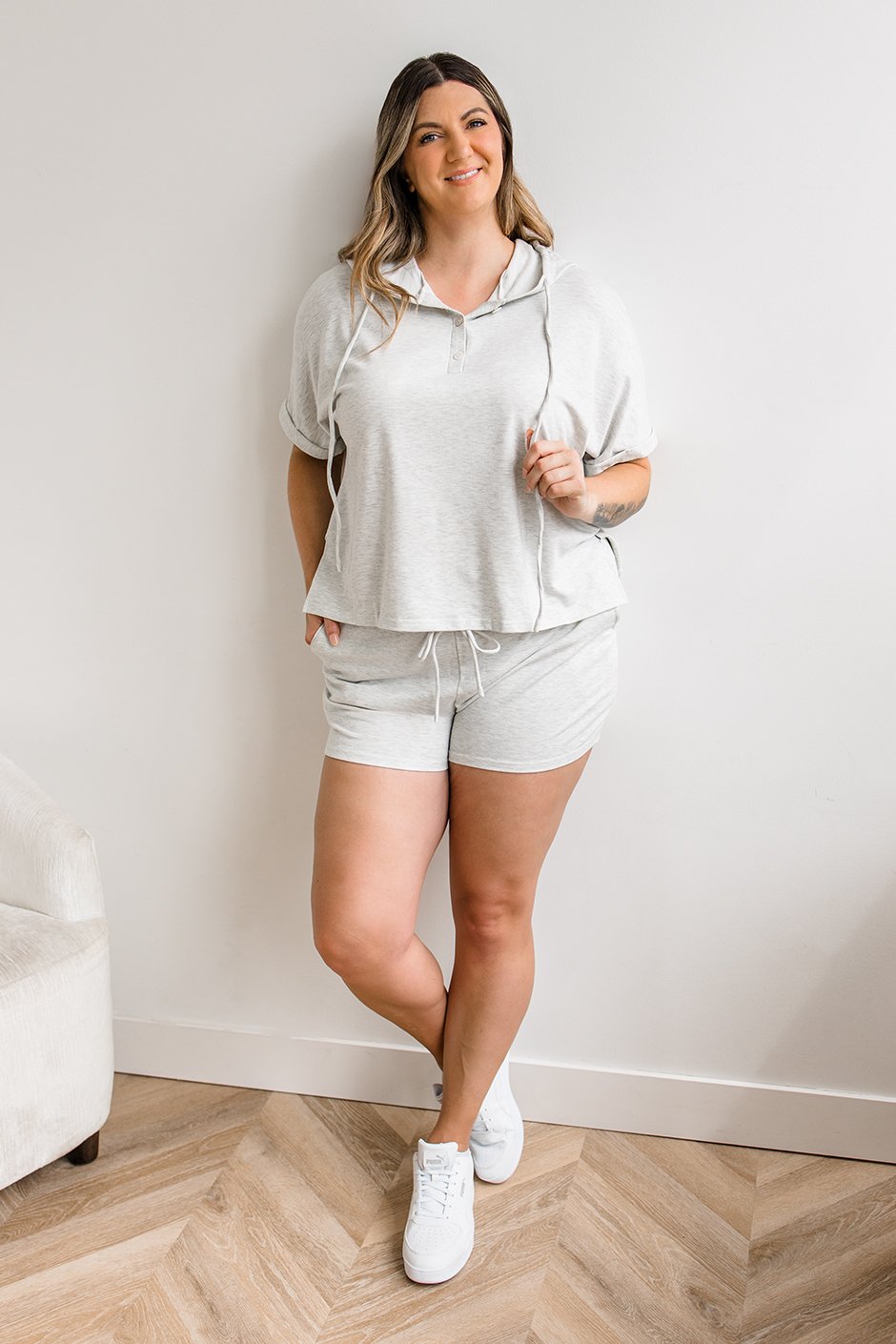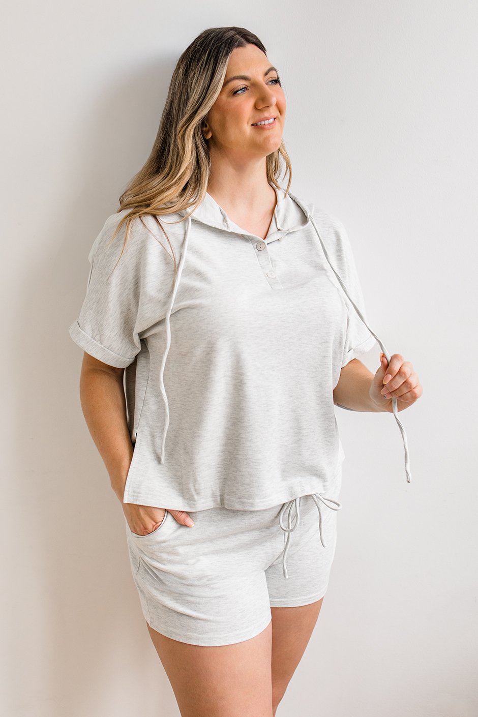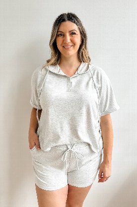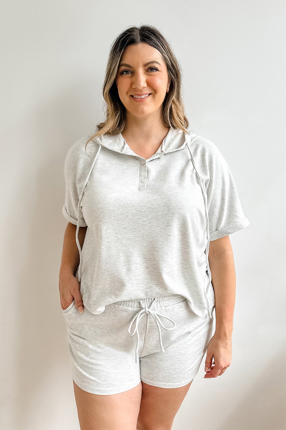 Soft mode: activated! This cozy terry set brings a relaxed, elevated feel with a henley-style hoodie and matching shorts that keep things effortlessly chic. Throw on sneakers and a cap for a quick coffee run, or swap in gold hoops and slides for an easy, polished look.