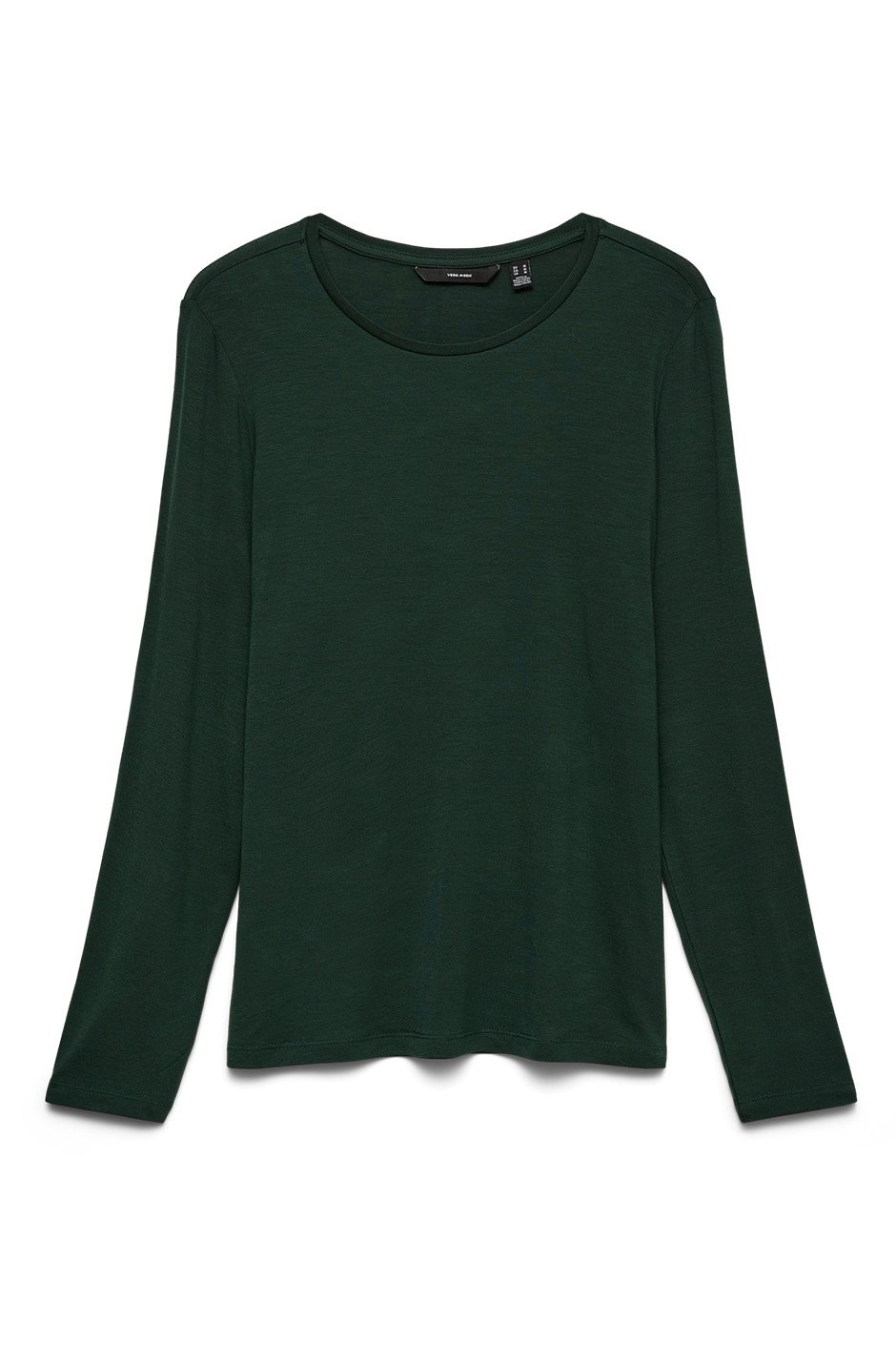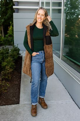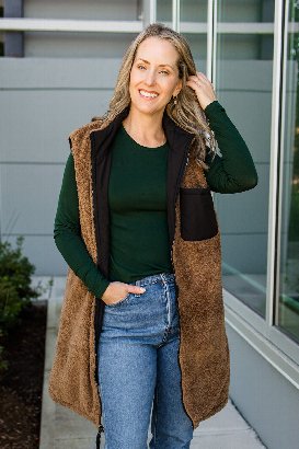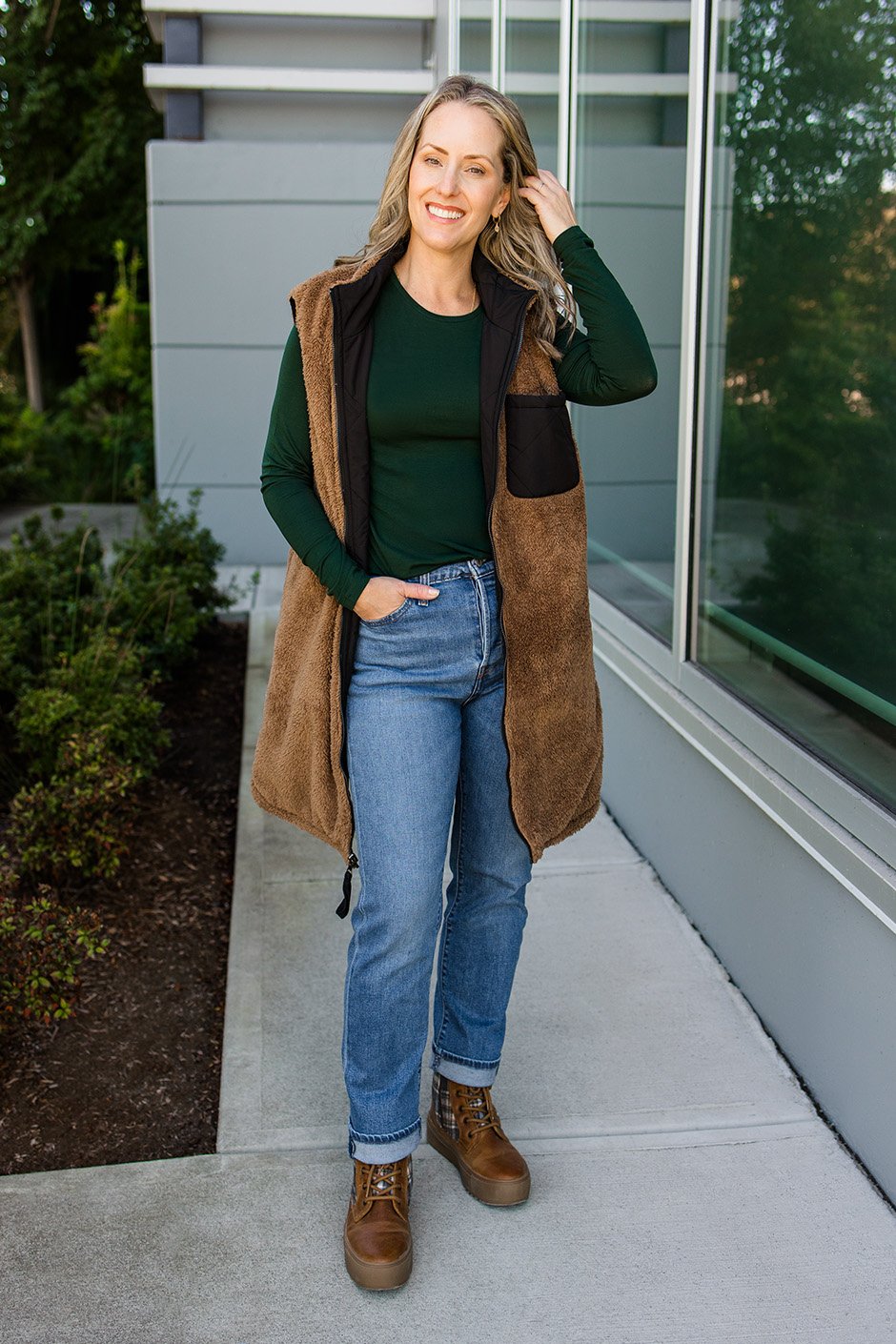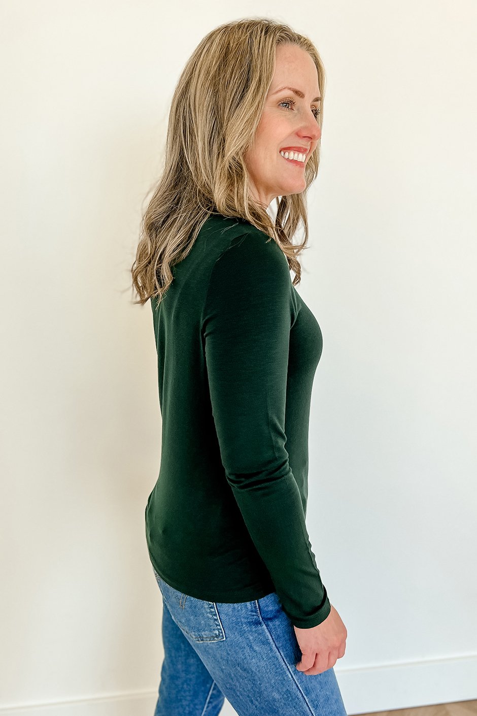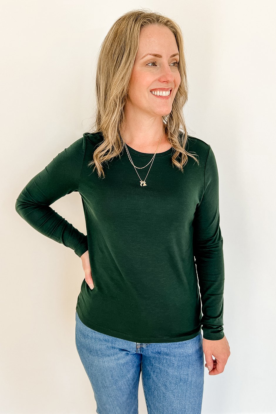 Talk about a perfect basic! I'm wearing a size small and it fits really well, super soft and stretchy, with a comfy round neck and long sleeves. It comes in three colors, and the wine shade is soo in right now. Great length too, looks really cute tucked or untucked!