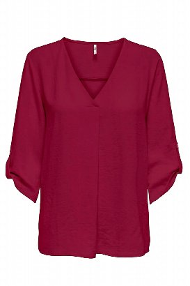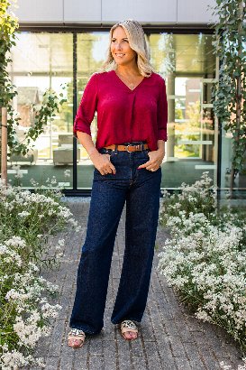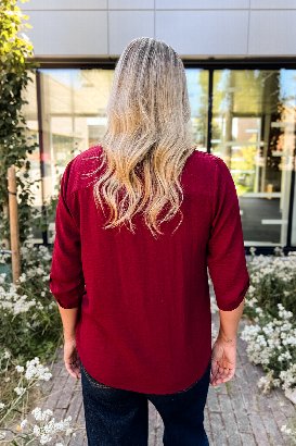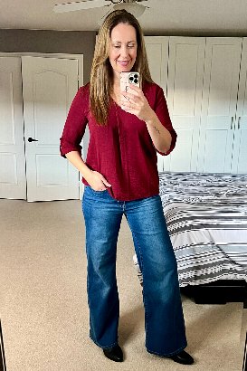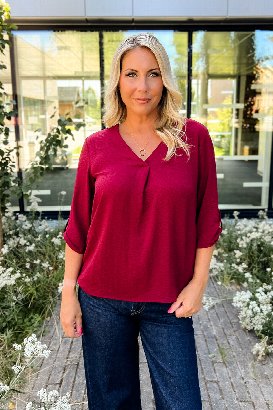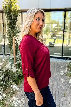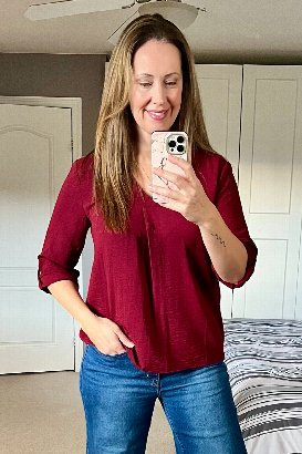 This is such a great dressier top! I love the v-neck with the front pleat. The sleeves have a button cuff so you can roll them and they stay put. The material is a crepey feel and it flows so nicely. I'm wearing my usual size 38 (approx size M) in the Merlot colour and a size 40 in the Off White Colour. I would stick with your true size in this, unless you need more room in the chest/back, then you could size up.