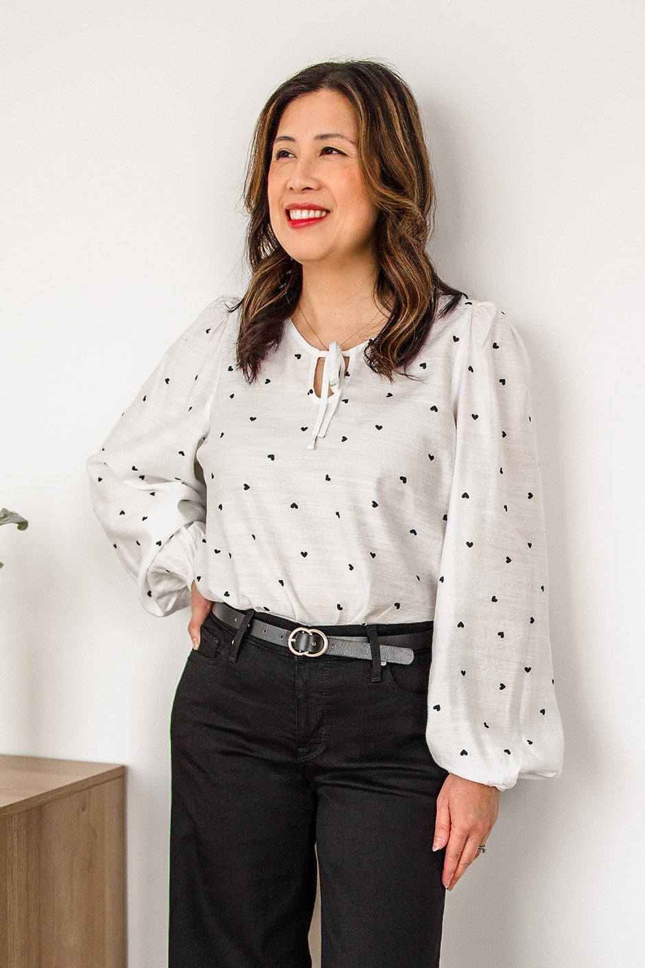 This top is so pretty! I love the tiny hearts fluttered all over. This is a lightweight woven top with little stretch but I love that this gives it beautiful structure and drape. The tie can be knotted how you like or it can be left undone. I love the gathered cuff since it forms a pretty balloon sleeve. I am usually size Small in tops which can be translated to 36 in Euro sizing but I am wearing size 38 here for an easier fit. I will stick with size 38.