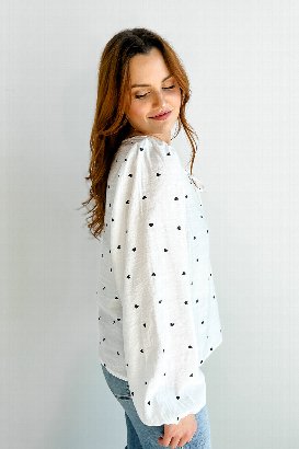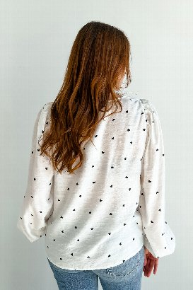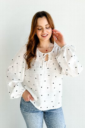 This top is absolutely adorable! The heart pattern is so cute and the tie detail at the chest is really flattering. Those balloon sleeves with elastic cuffs are everything and it's super lightweight which makes it perfect for any season. It comes in white and navy, both colors are gorgeous! I wore a size small and it fit perfectly true to size. Honestly obsessed with this piece! 💕