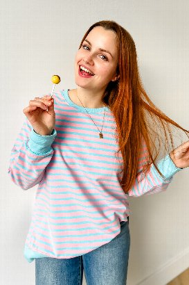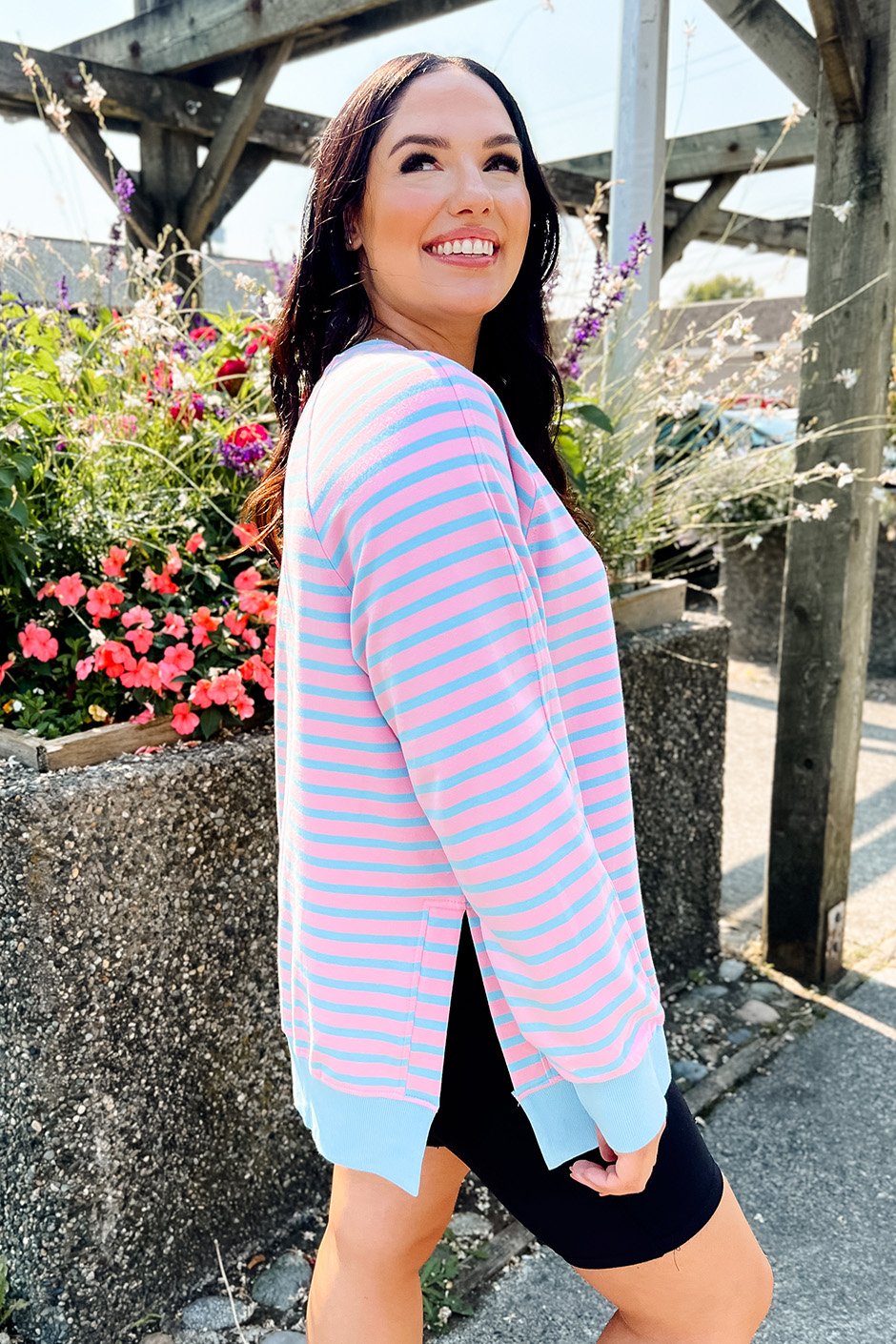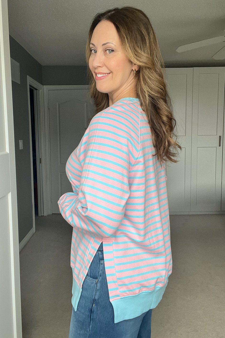 I love the stripe options in a classic white & black or add some colour with the pink & blue! The stretch on this sweatshirt is fantastic and it’s soft and feels great on. I appreciate the side slits for extra movement. I’m wearing my usual size medium and found it to be on the looser side. It worked great with leggings! I think the size small would’ve fit well too to wear with jeans.