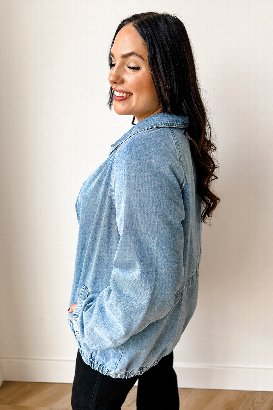 This denim jacket has a classic collared look with elastic at the hem and cuffs that creates a flattering fit. The raglan sleeves give you plenty of room to move and keep things comfortable all day long.