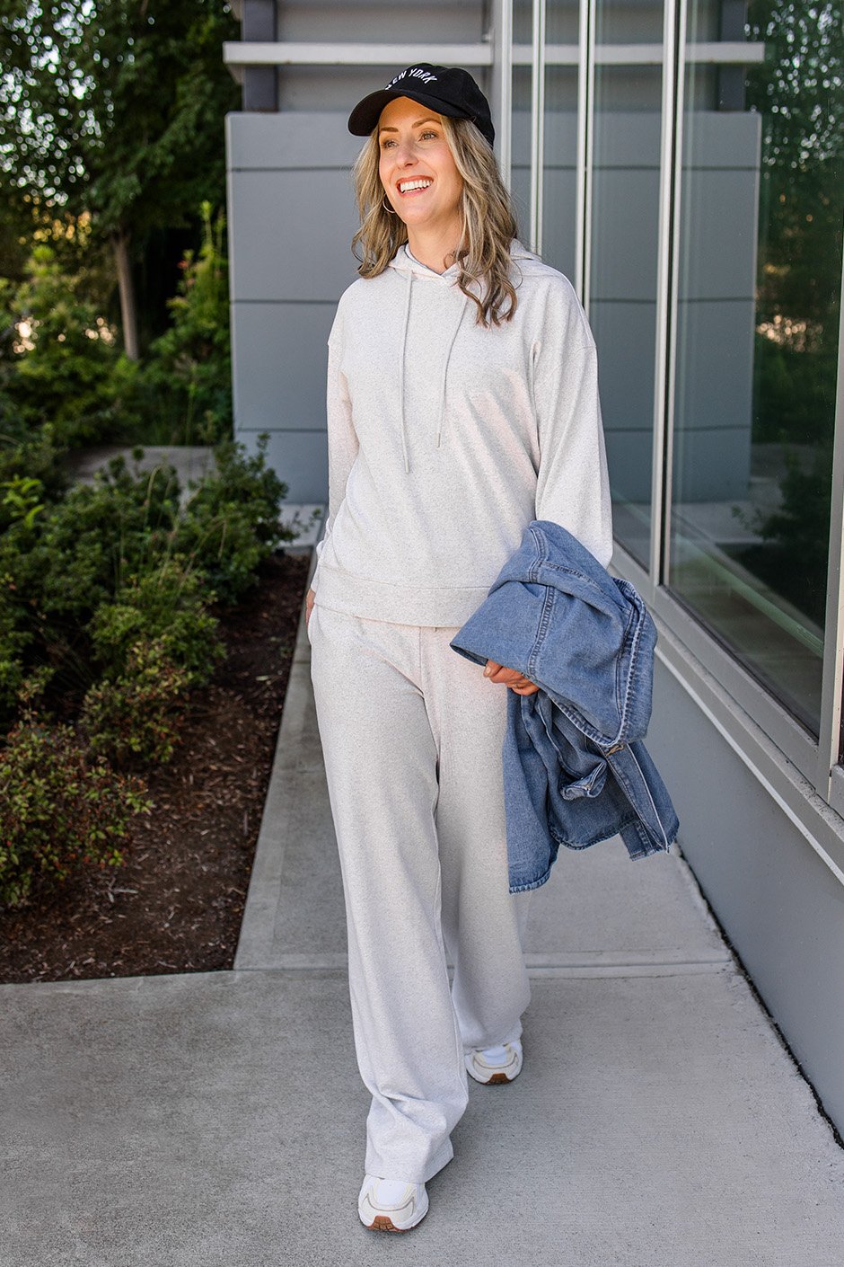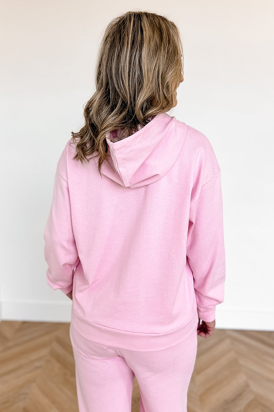 I’m loving the fit of this hoodie; it’s super lightweight, which makes it perfect for layering. I wore it under a denim jacket and it didn’t feel bulky or too warm, just super comfy while still giving that cute layered look! I’m obsessed with the pink color too; it’s seriously adorable. I’m wearing a size small and the fit is great with the perfect length.