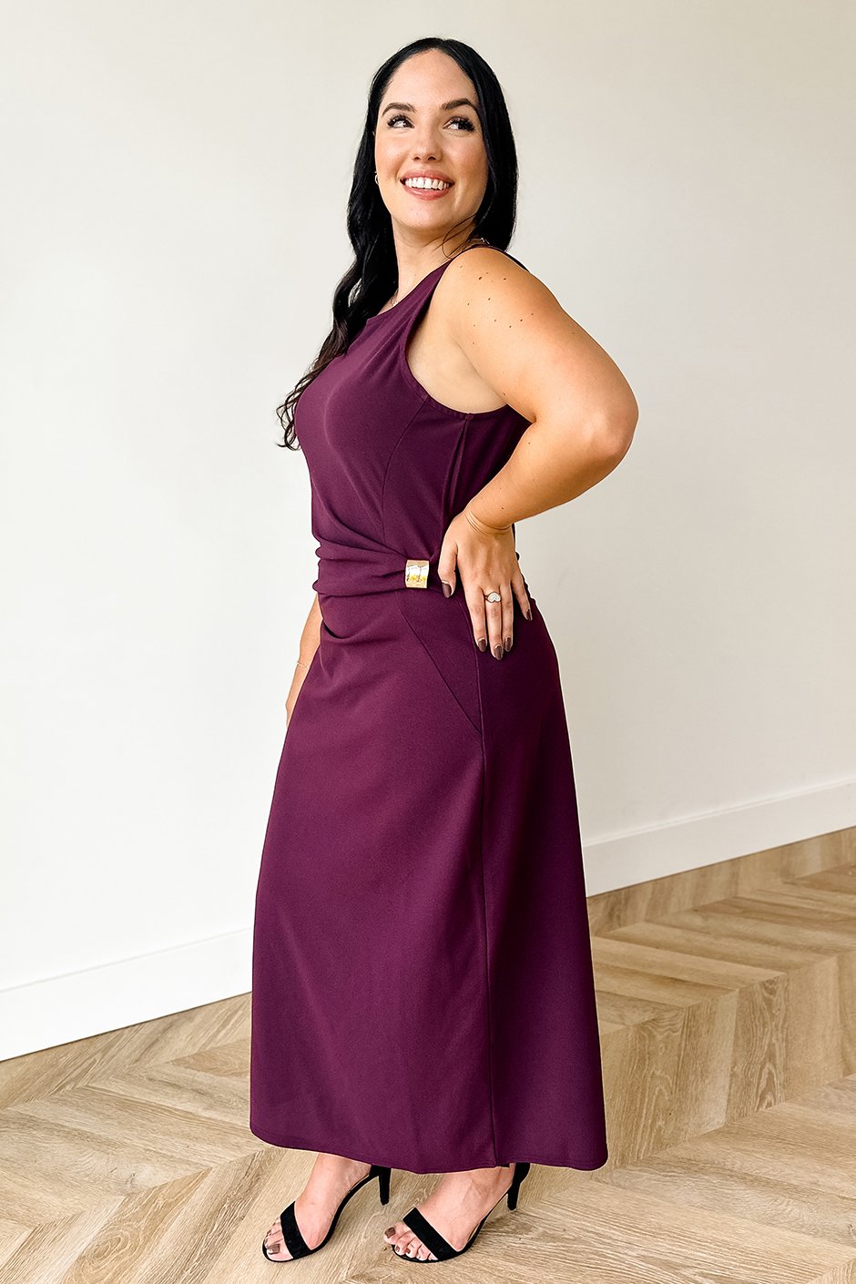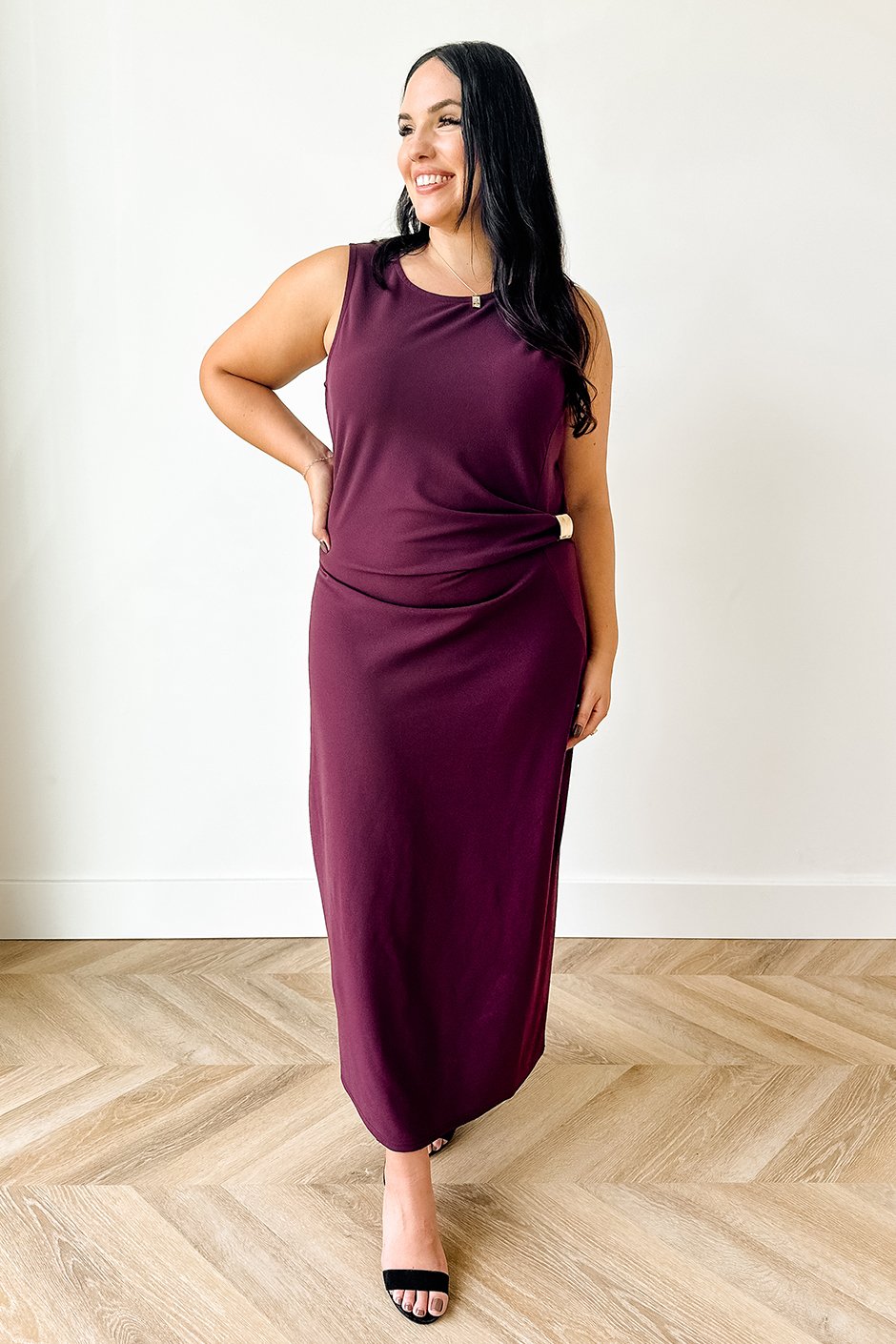 The Twist of Fate Dress has stretchy crepe-like fabric that drapes beautifully to an elegant length. The metal buckle detail elevates the sleek silhouette. Perfect for evening events, holiday parties, or anywhere you want to make an entrance with statement heels.