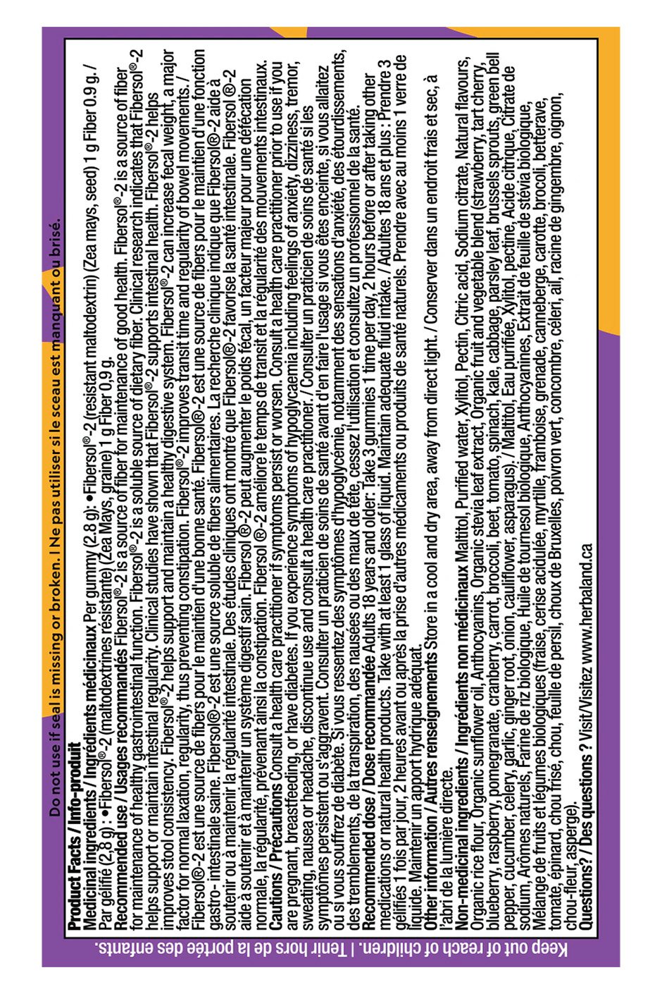Non-medicinal ingredients: Maltitol, Purified water, Xylitol, Pectin, Citric acid, Sodium citrate, Natural flavours, Organic rice flour, Organic sunflower oil, Anthocyanins, Organic stevia leaf extract, Organic fruit and vegetable blend (strawberry, tart cherry, blueberry, raspberry, pomegranate, cranberry, carrot, broccoli, beet, tomato, spinach, kale, cabbage, parsley leaf, brussels sprouts, green bell pepper, cucumber, celery, garlic, ginger root, onion, cauliflower, asparagus)