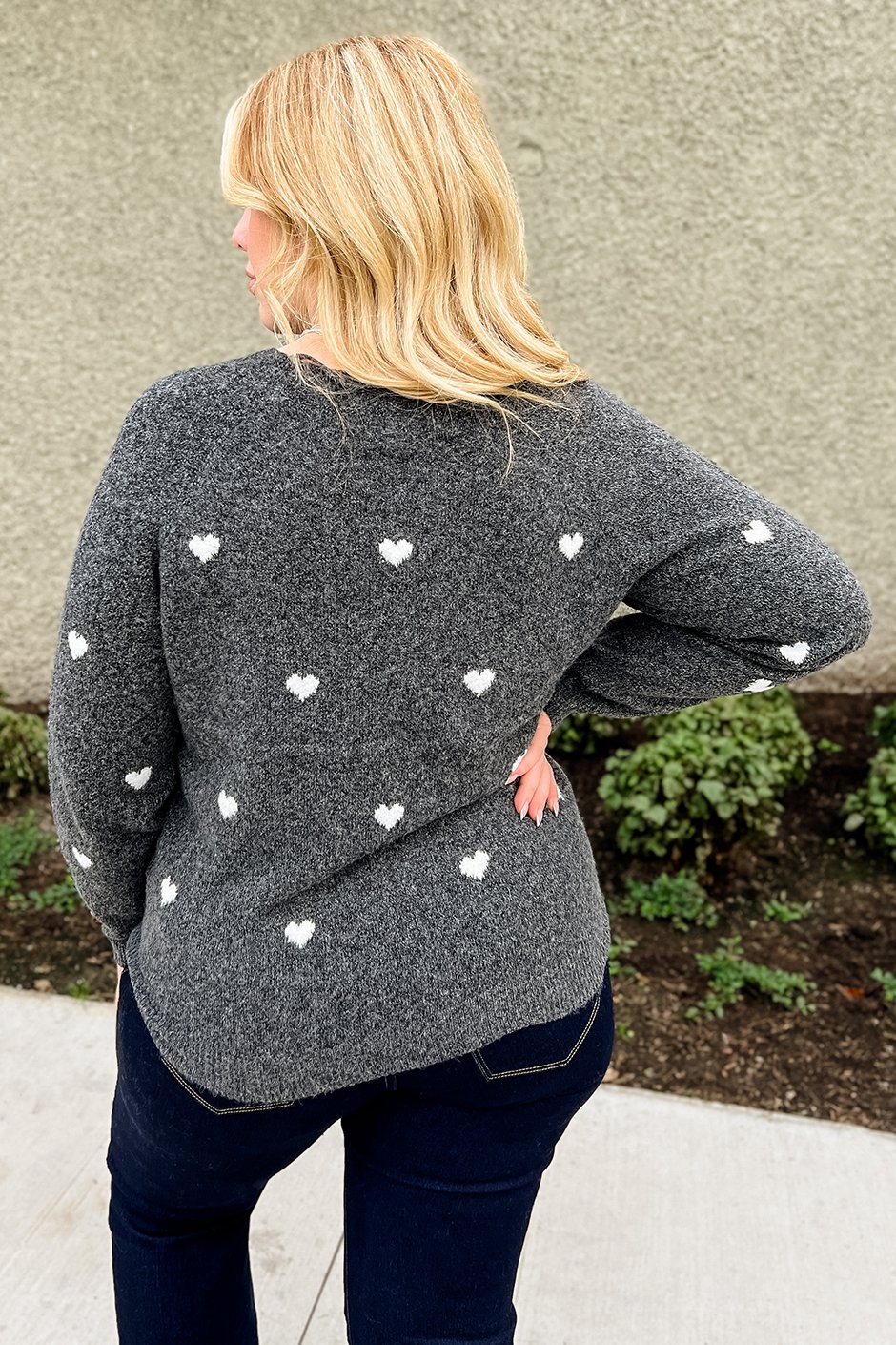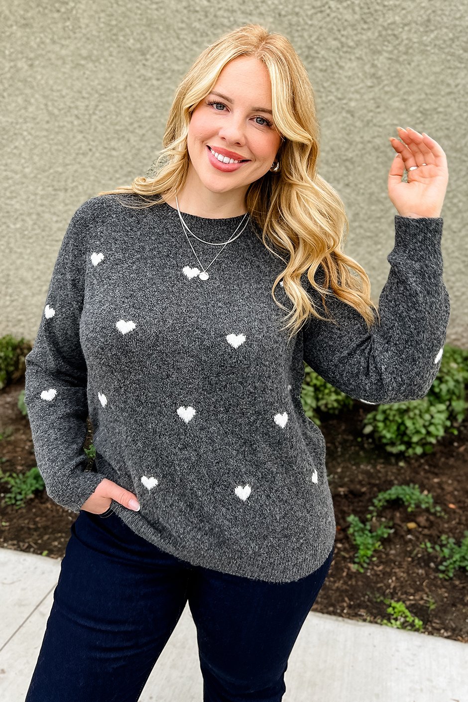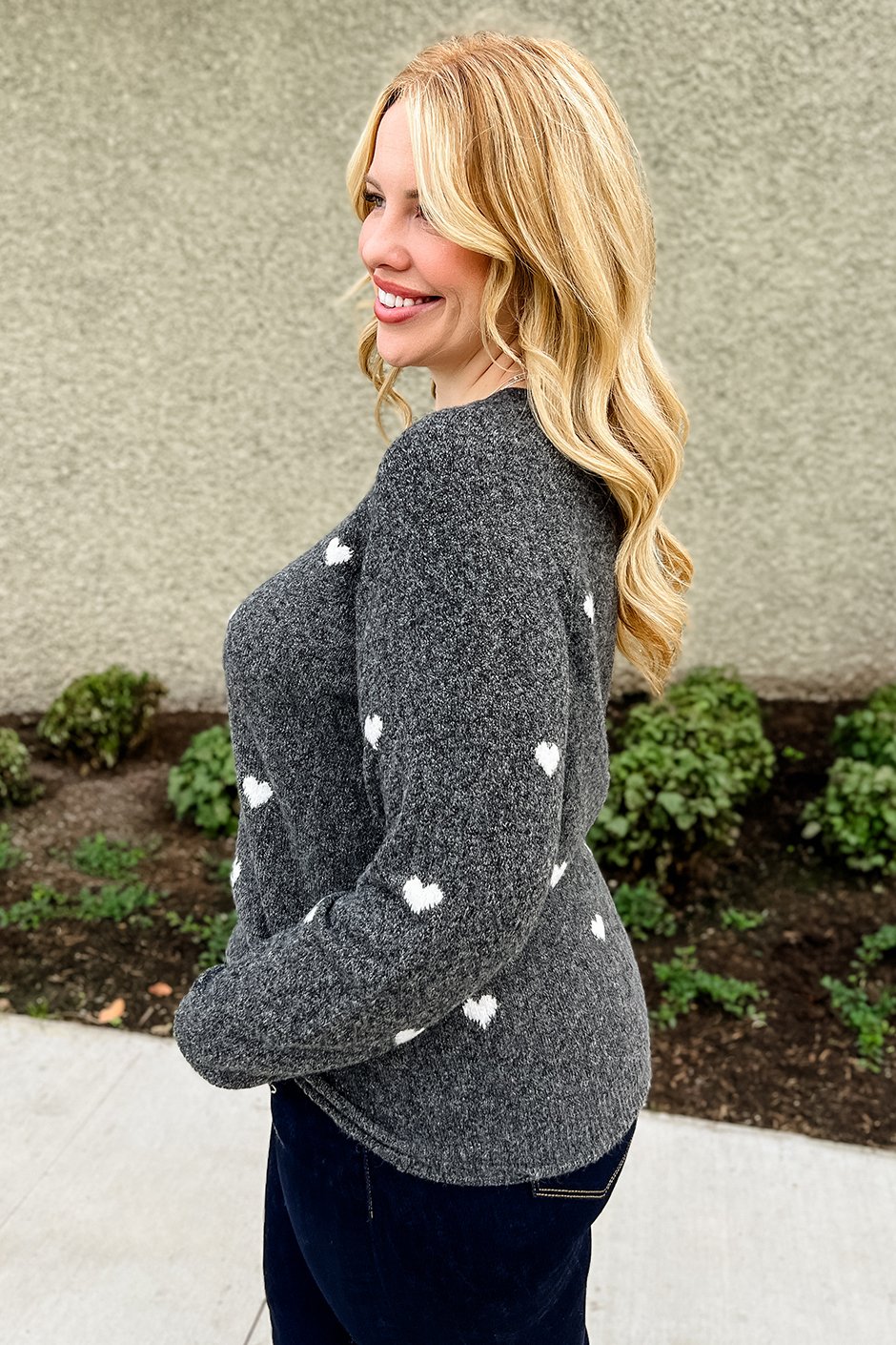 An incredibly soft sweater with sweet little hearts is what everyone needs in their wardrobe! I always prioritize comfort and style; this sweater makes that easy. I found the body length perfect as well as the arm length. It came down to my hips, which is exactly where I want a sweater to sit. I'm in my true size XL and love the cozy fit. Because of how stretchy this is, I could also fit the large but will stick with the cozy fit of the XL.
