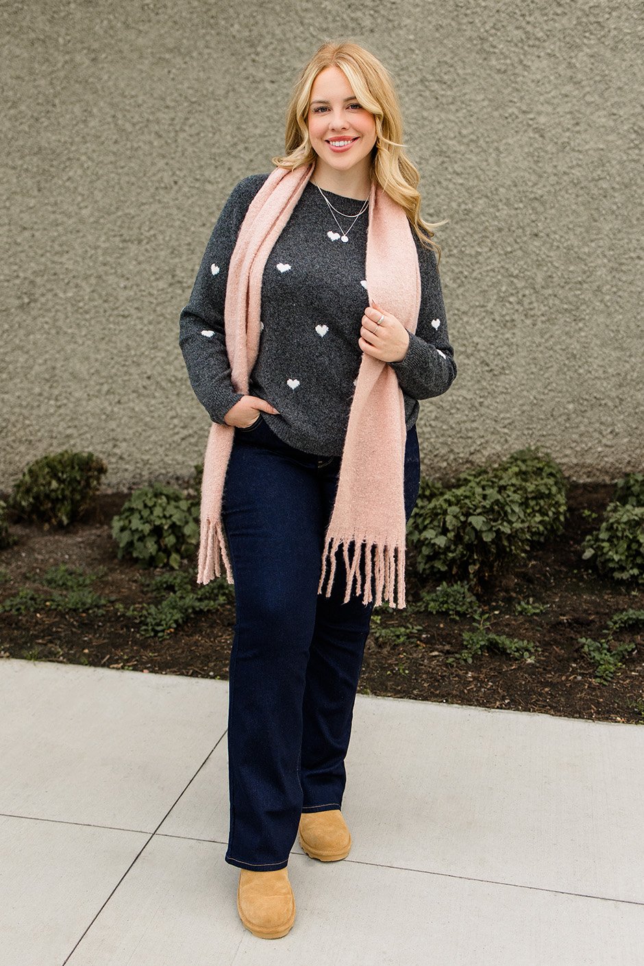 This heart sweater is giving me literal heart eyes! Not only is it the cutest heart pattern, but the fabric is so incredibly soft. I don’t think I even own a sweater this soft or cozy. The length of it is perfect! Not overly long and not too short. The fabric has so much stretch and the softest, brushed-like feeling to it. I’m in the small and find it very true to size.