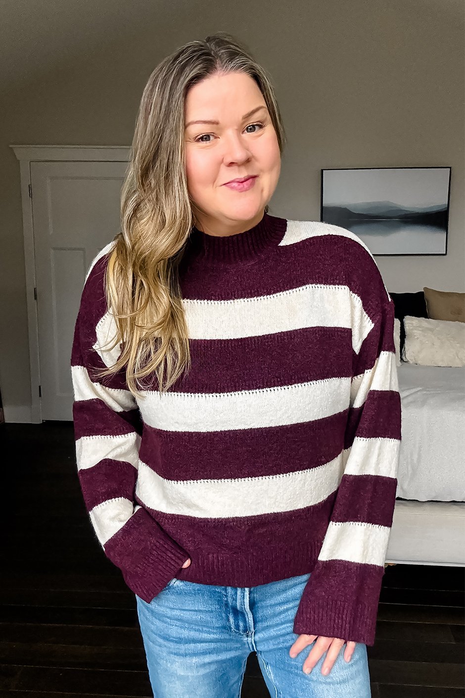 It’s sweater weather and this is going to be THE cutest addition to your sweater collection! The fabric is super soft and comfy, not itchy or tight at all, which is perfect for mocknecks because nobody wants to feel restricted or claustrophobic. It has just the right amount of stretch and is really lightweight and breathable, so it’s great for layering or wearing indoors without overheating. The length is perfect, not cropped but not too long either, just that perfect in-between. Plus, the little stripe and pointelle detail give it such a pretty, low-key vibe. I wore a size small and this is exactly what I’d order. Love!!