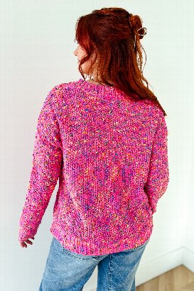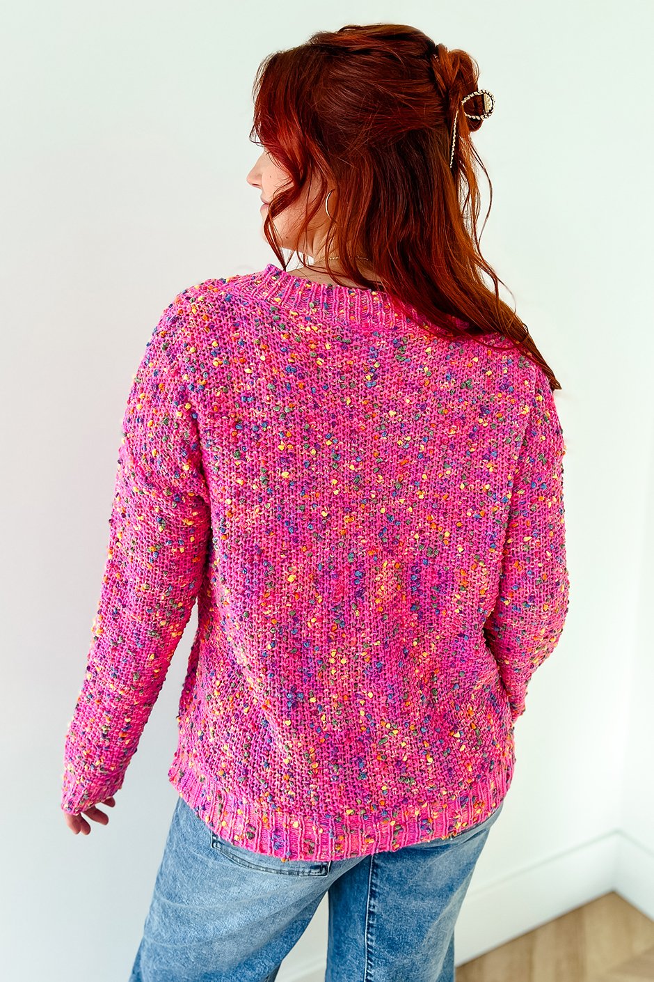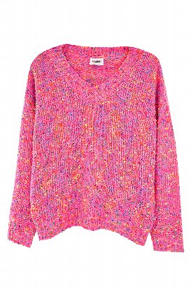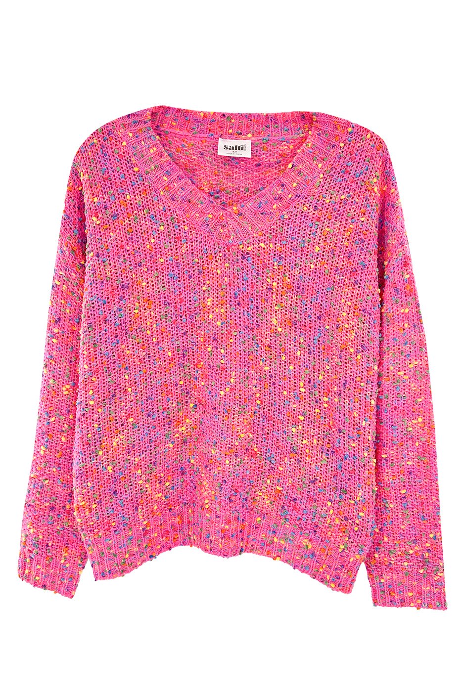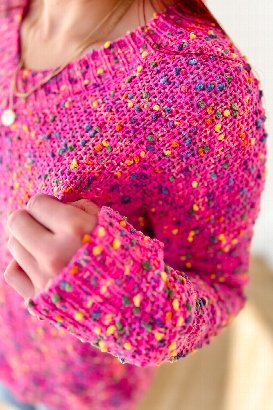 This colorful V-neck sweater is cozy and cute, with bright popcorn-style flecks that add a fun, textured detail. Perfect for layering or wearing on its own for a fresh, everyday look.