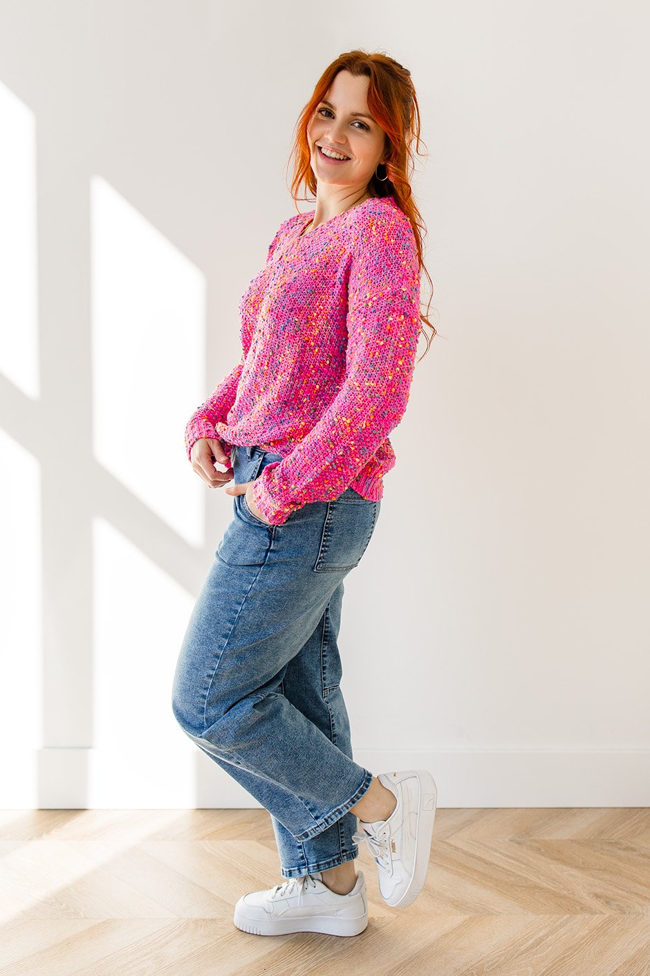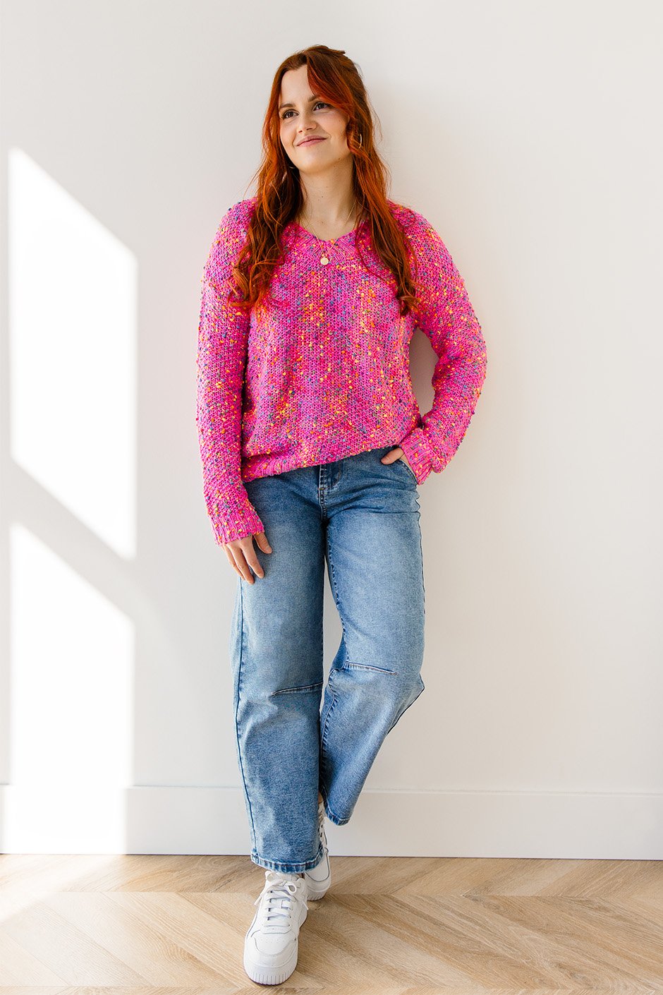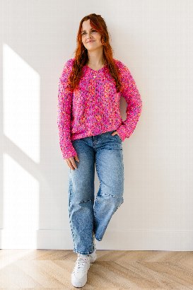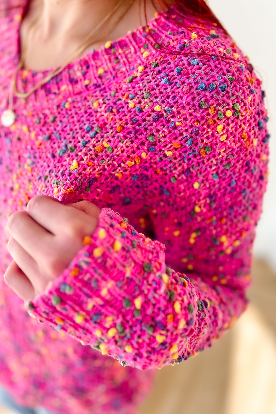 This colorful V-neck sweater is cozy and cute, with bright popcorn-style flecks that add a fun, textured detail. Perfect for layering or wearing on its own for a fresh, everyday look.