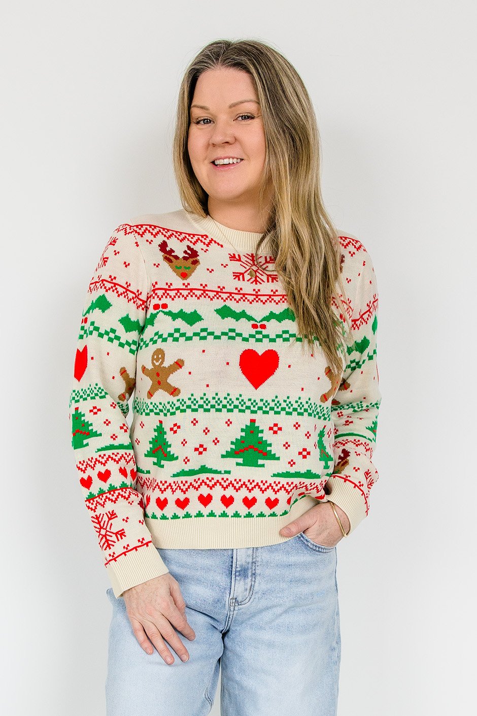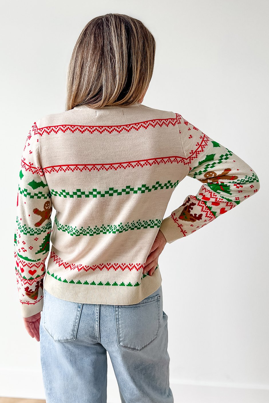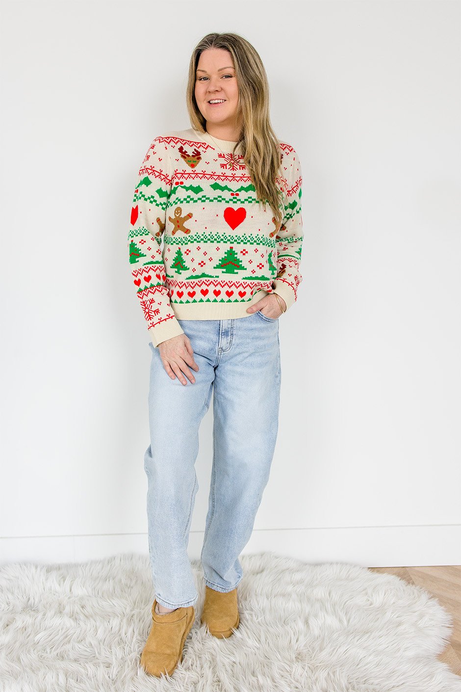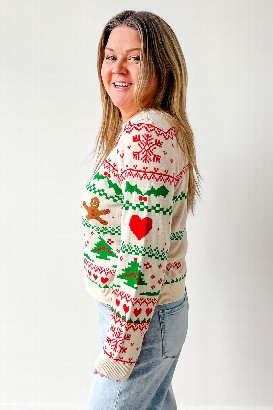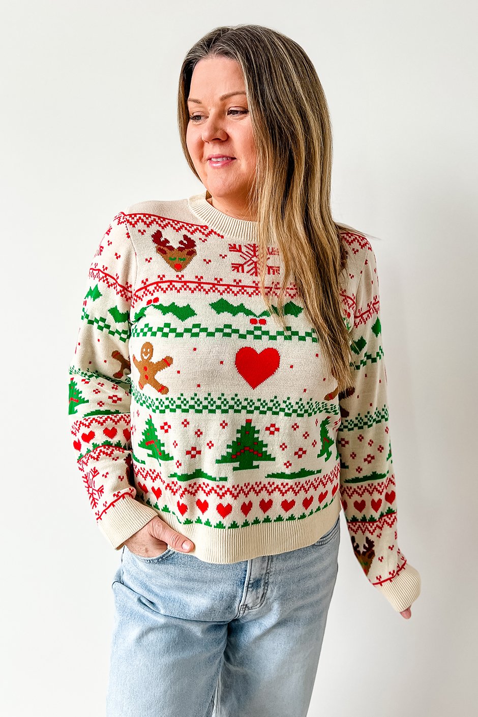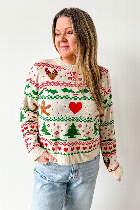 This sweater is the perfect mix of festive, funny, and surprisingly flattering. It brings all the classic “ugly Christmas sweater” vibes but with a cute, cozy twist. The design is bold and cheerful, exactly what you want when you’re trying to spread a little holiday spirit. I’m wearing the size medium, which has a slim'ish fit but still feels comfortable with just the right amount of looseness. The small fits too, but I prefer the slightly more relaxed look of the medium. I am typically a s/m in a sweater like this.