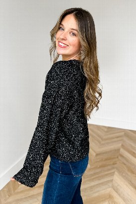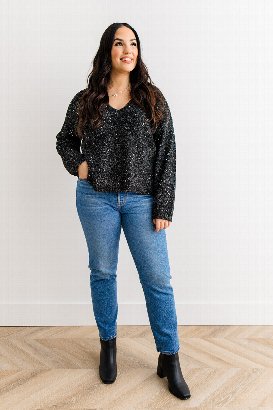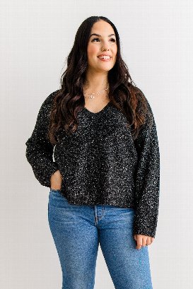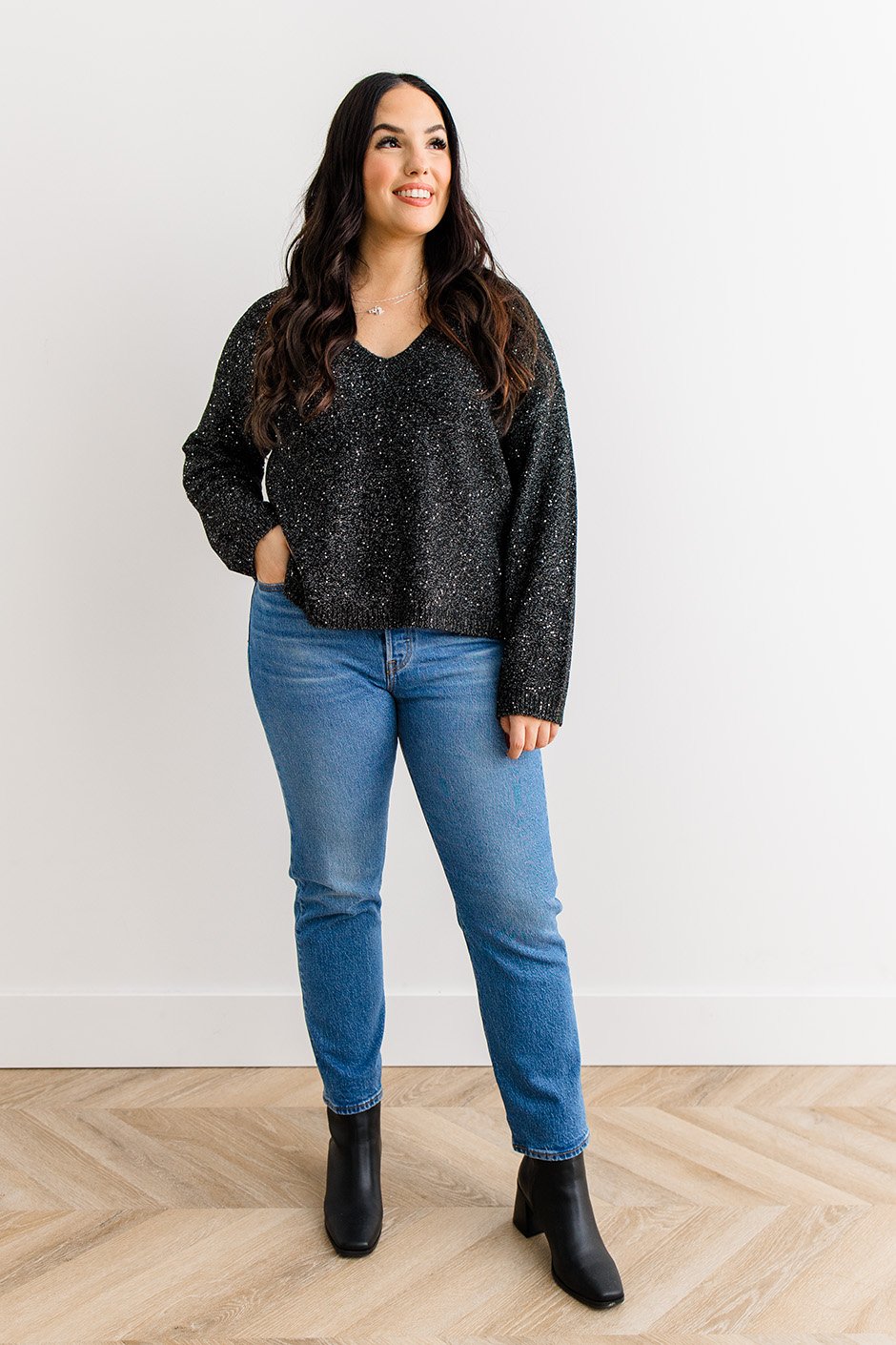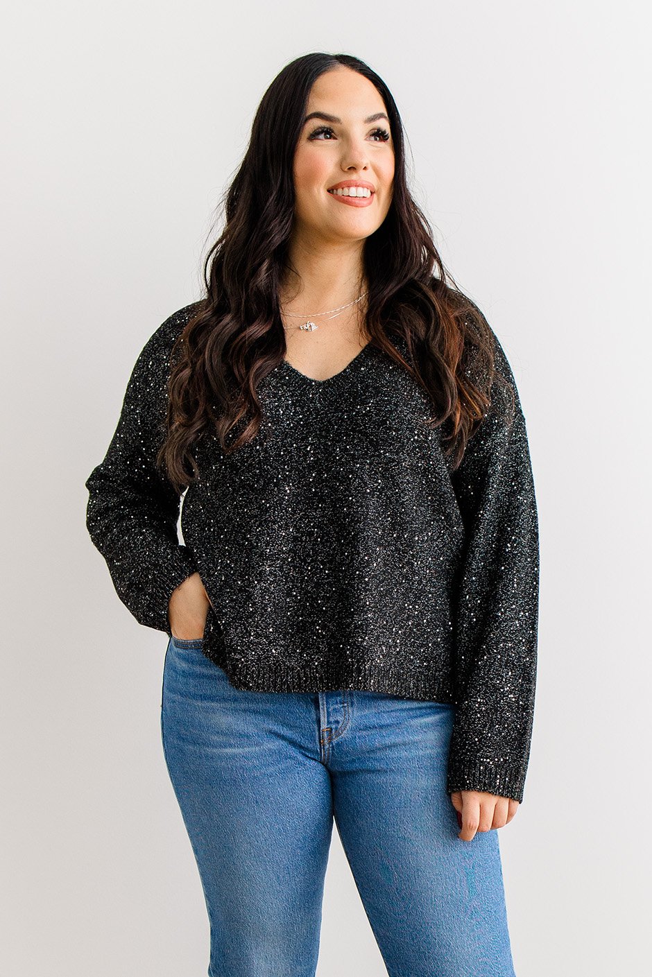 You can't help but shine bright wearing this sweater!! It’s soft, stretchy, and has just enough sparkle from the sequins to feel festive without being over the top. The V-neck gives it that effortless, laid-back look, and the drop shoulders make it feel super relaxed and cozy. The fabric has this really pretty metallic fiber throughout it, adding an extra subtle sparkle. I'm in my true size large and I love the fit!