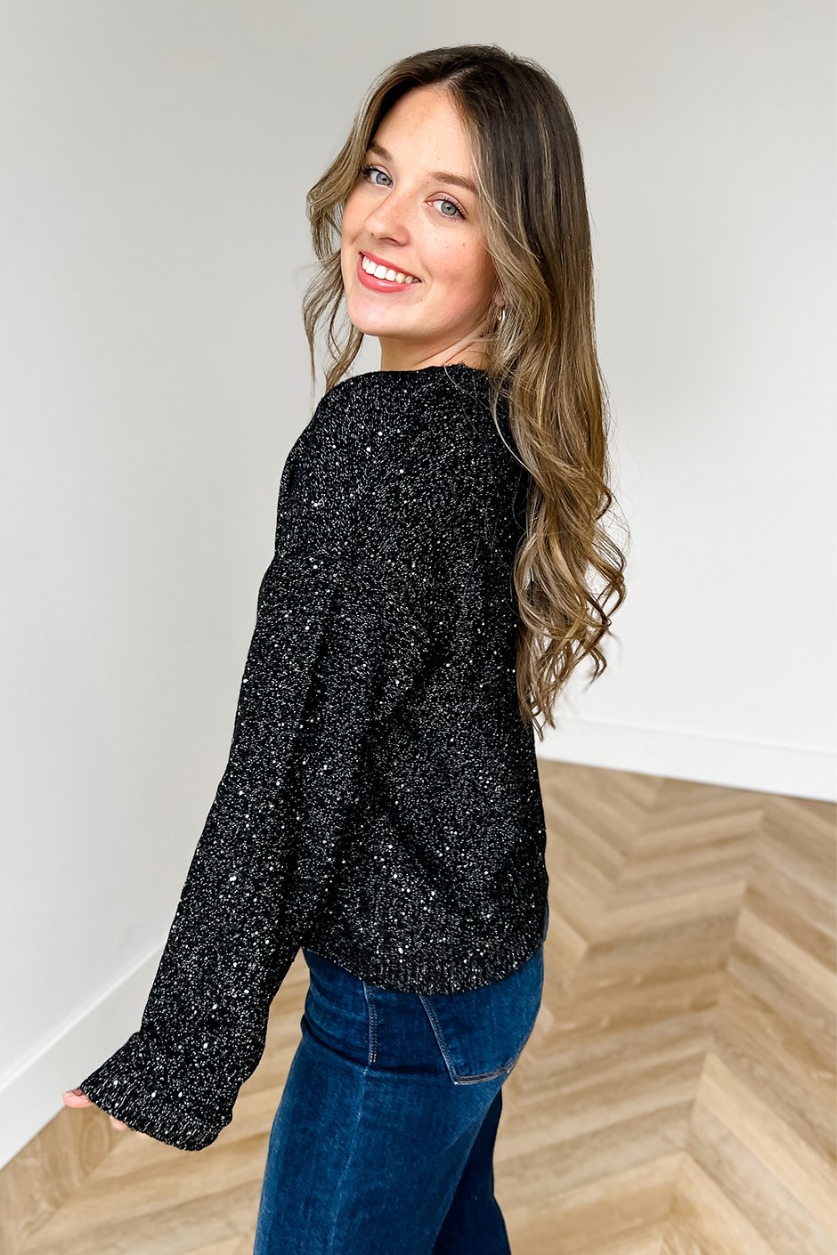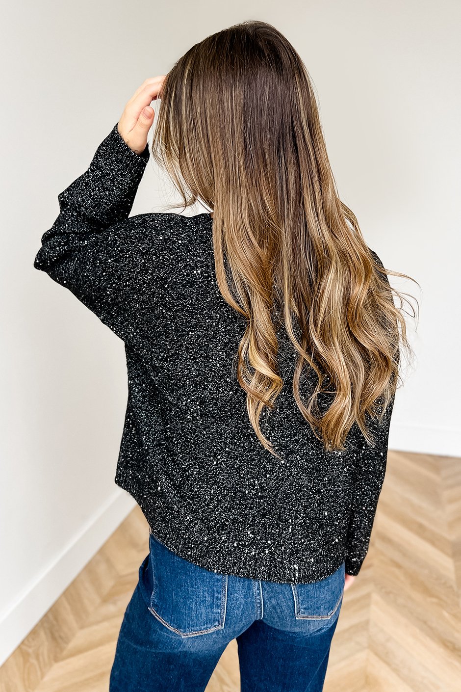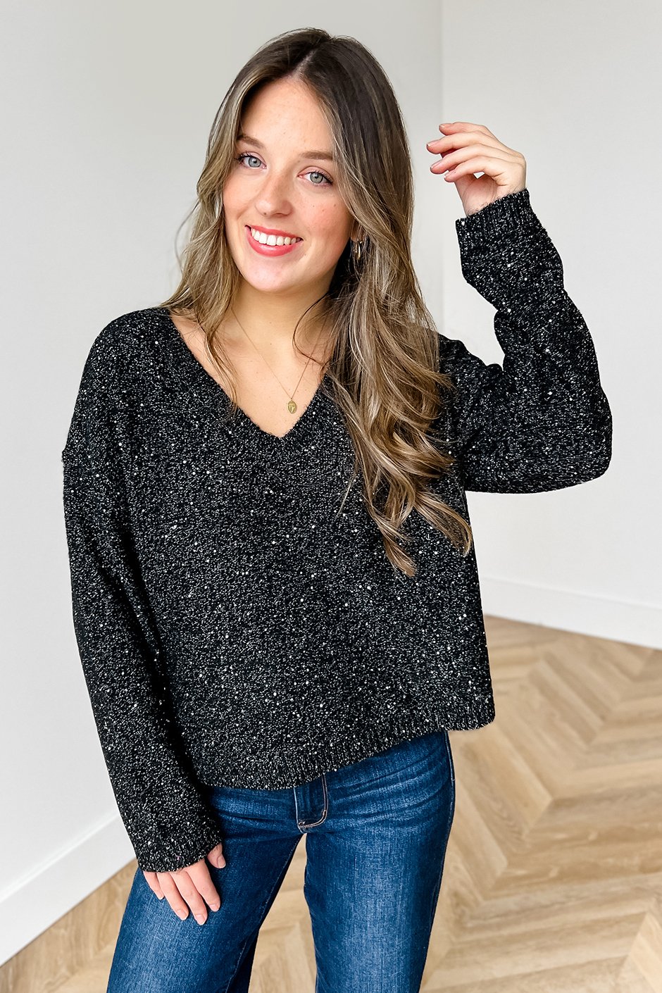The Starstruck Sweater brings a soft, stretchy feel with sequins that catch the light just right. It’s comfy with a little sparkle, making it an easy pick for holiday parties, New Year’s plans, or any time you want your outfit to shine a bit.