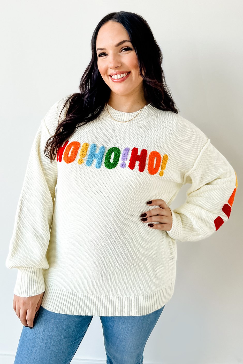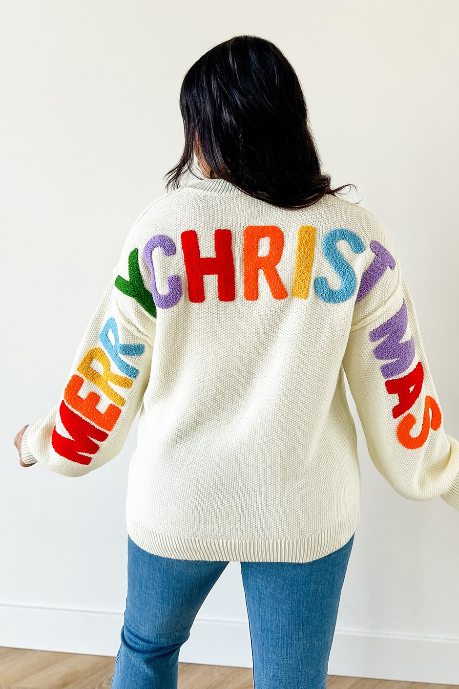 I’m in love with this sweater! 🎅 The soft, waffle-like knit is super comfy, warm and a little on the heavier side but nothing too crazy. The cream color literally goes with everything, and the “HO HO HO” on the front is adorable. But my favorite part? The “MERRY CHRISTMAS” that goes all the way across the arms and back, it’s so cute! I'm wearing my true size large and I like the fit, if you wanted this one to be a little baggier and oversized you could definitely size up if you wanted to. It’s festive without being too over the top, just the right mix of simple and fun.