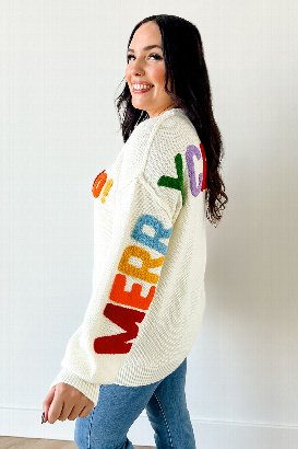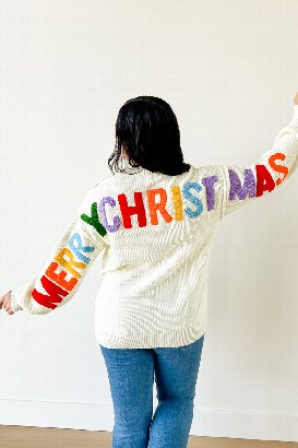 The Merry Everything Sweater is unique and gorgeous with its soft, waffle-like knit and chenille details. The texture alone makes it stand out, and the festive touches bring all the holiday cheer. Makes a fun gift for anyone who loves a statement sweater.