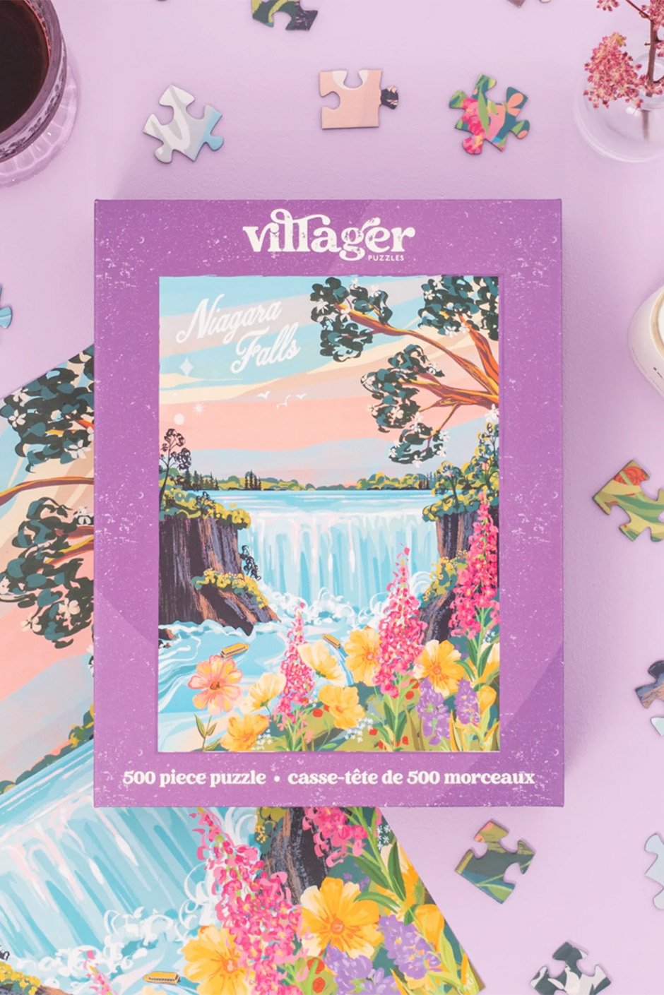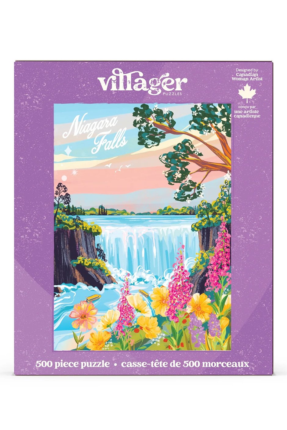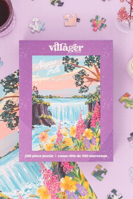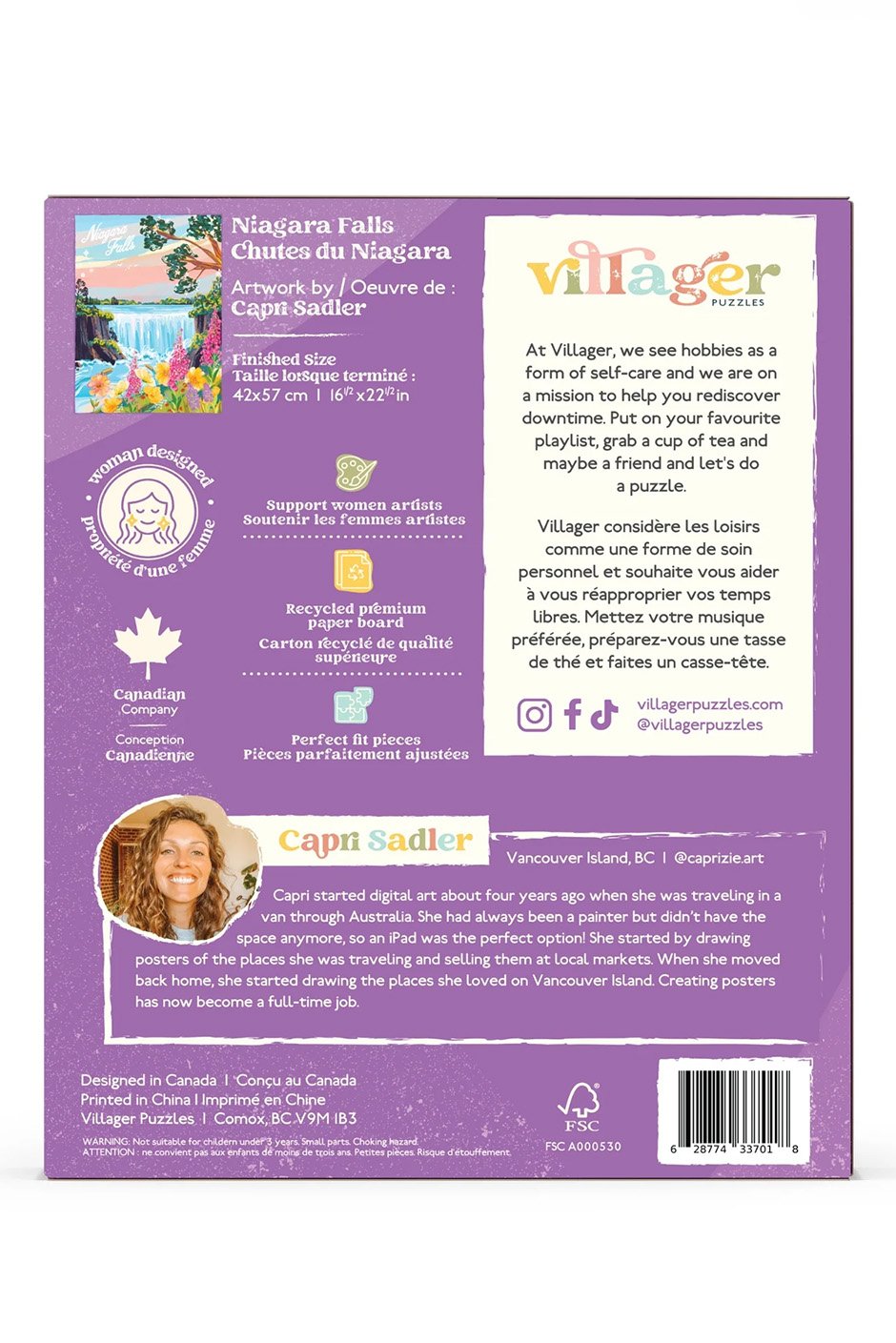 Feel the power and wonder of one of Canada’s most iconic landmarks, featuring a sweeping view of Niagara Falls. Illustrated by BC artist Capri Sadler, this scene captures the falls from a lookout above, complete with tour boats navigating the mist and rushing water below. It brings the thrill of the falls and the beauty of the journey to your table—no poncho required.