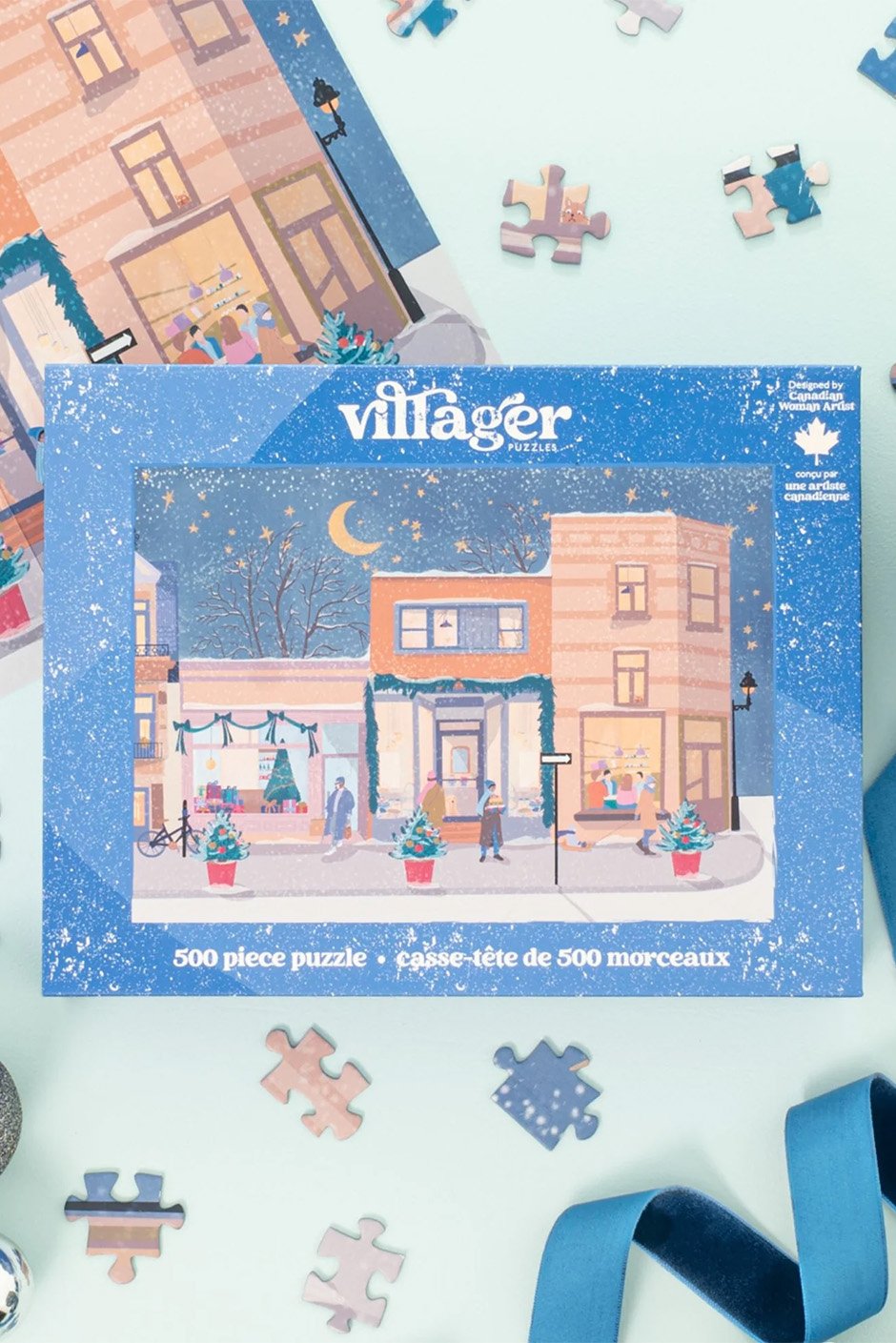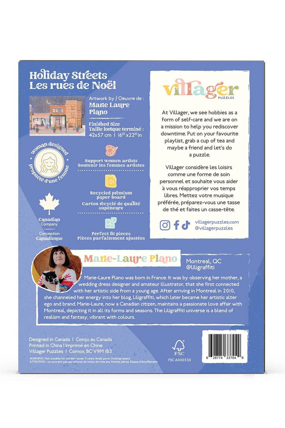 This lively puzzle captures the hustle and bustle of Montreal streets during the holiday season— a winter streetscape filled with festive cheer. Designed by Canadian artist Marie-Laure Plano, the artwork celebrates community, tradition, and the joy of gathering in the city during the most magical season of the year.