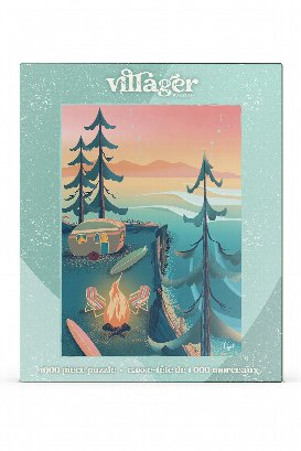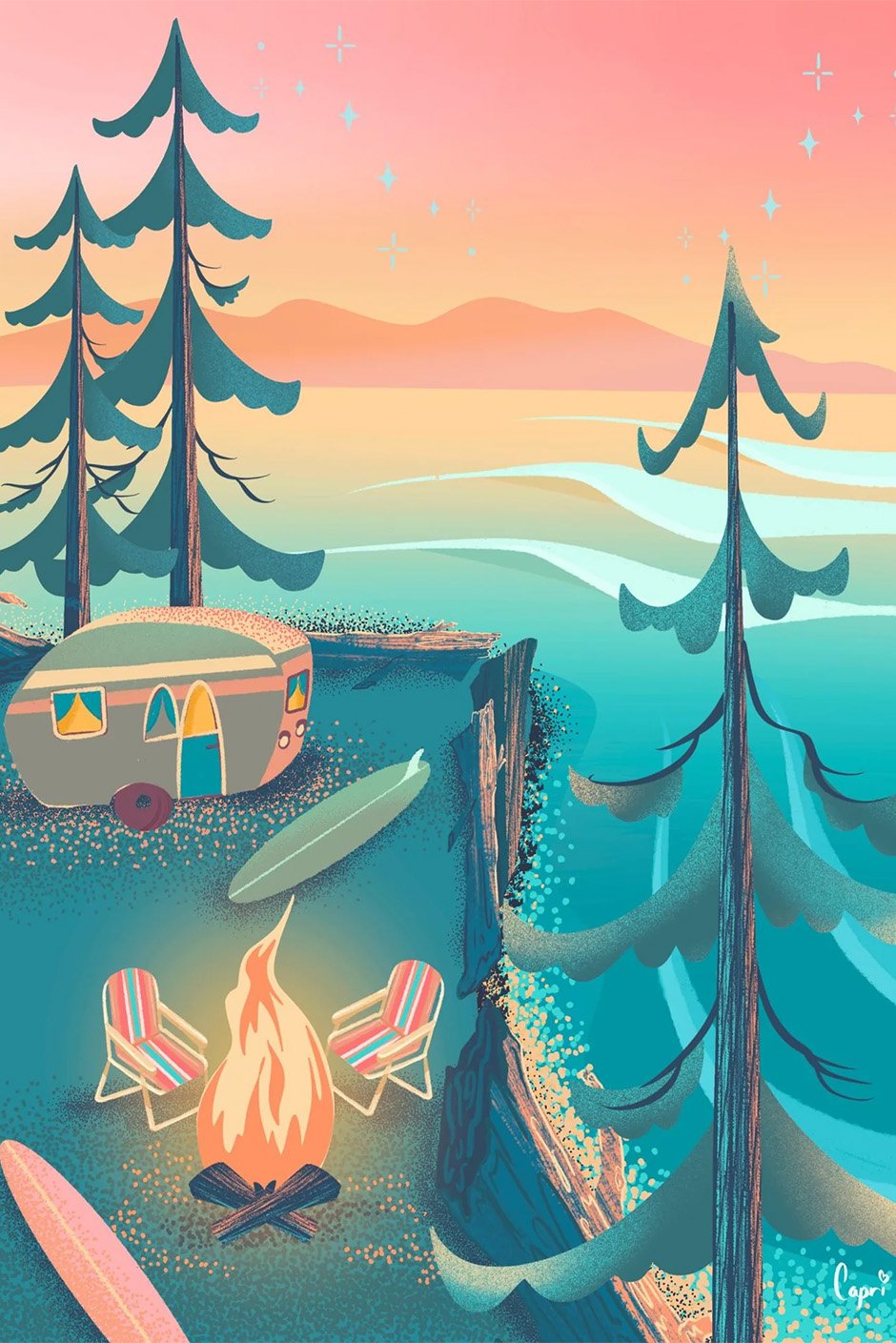 Enjoy a gorgeous pastel-coloured sunset overlooking the ocean. Beautifully illustrated travel poster puzzle of a cozy camping trailer perched on a cliff overlooking the peaceful ocean waves below. Designed by Vancouver Island artist Capri Sadler.