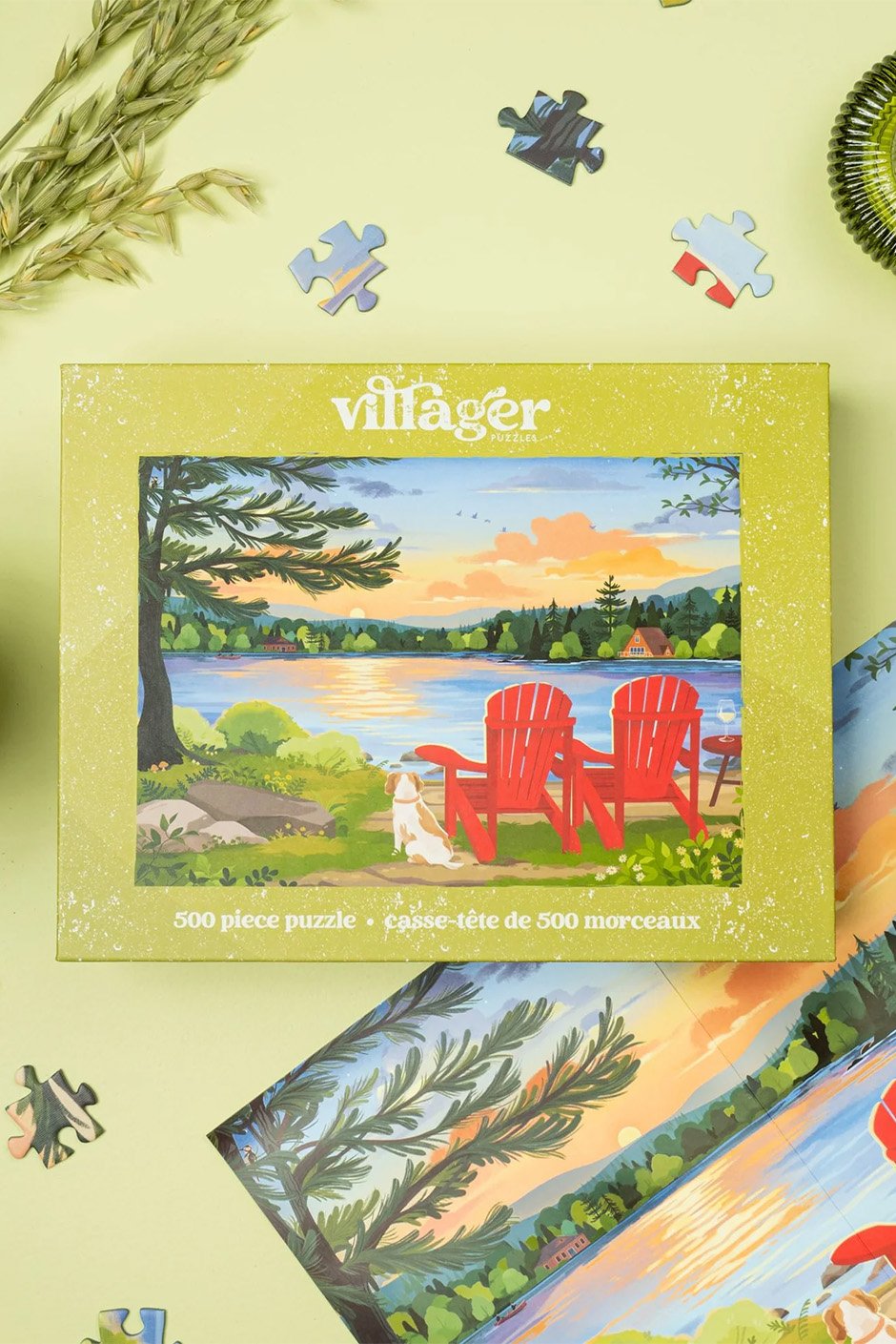 Unwind at the lake with this serene puzzle. Piece together a peaceful sunset scene featuring two classic Muskoka chairs at the water’s edge, a loyal dog by their side, and a glass of wine waiting to be enjoyed. Across the lake, cozy cottages dot the shoreline, completing this perfect escape to cottage country. Illustrated by Toronto artist Nicolle Lalonde.