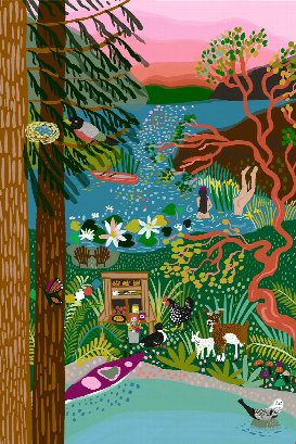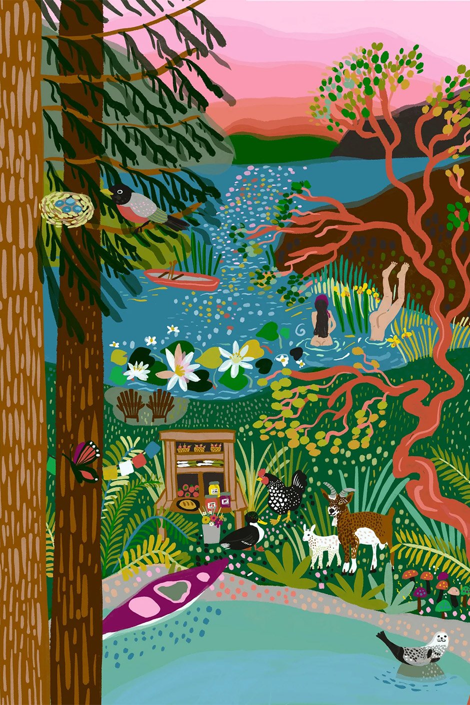 A beautiful island off the west coast of Canada, Salt Spring Island is known for its gorgeous ocean views, arbutus trees, and farmers' markets. Illustrated by female artist, Anja Jane from Bowen Island, BC.