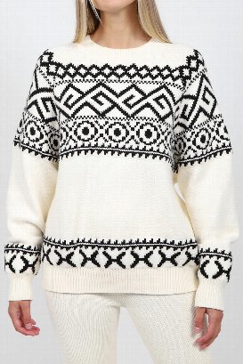An elevated take on a winter classic. The oversized body creates that plush, wrapped-up feel, and the drop shoulders add a relaxed shape. The Fair Isle pattern runs across the front and back for a beautifully detailed finish that feels premium. Pair it with simple gold accessories to let the knit take center stage.