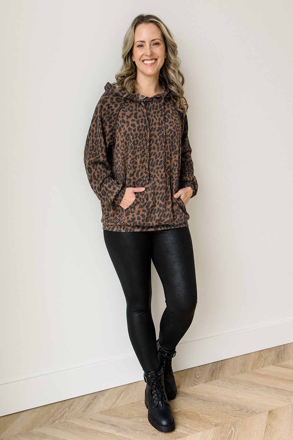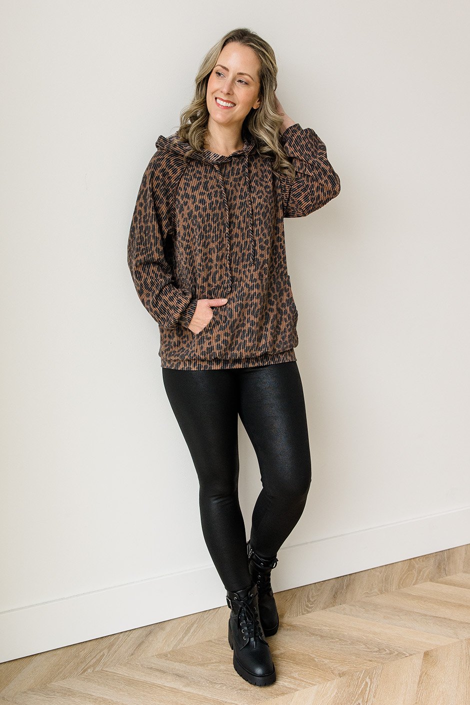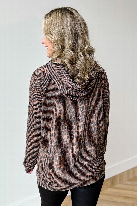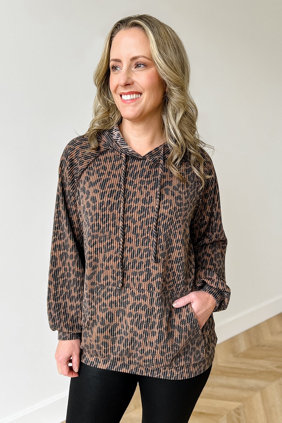 The Spot Theory Hoodie brings a full leopard moment in soft, stretchy rib fabric. It’s lightweight with a comfy kangaroo pocket; the kind of piece that instantly feels put together. Cute, effortless, and so good with jeans or leggings.