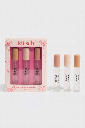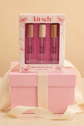 The KITSCH Holiday Hair Perfume Trio Set features patented odor-eliminating technology that refreshes your hair between washes. Each scent works solo or layered together to create your own custom fragrance. A quick spritz and your hair smells amazing without the heaviness of regular perfume.