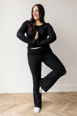 Yoga Pants or Flared Leggings. These are the same super soft and stretchy fabric as the Soft Motion Top. This is more lounge wear than athletic wear but I like the flare hem on these. The foldover waistband is adjustable and you can wear folded or unfolded. I am usually size Small in bottoms and this size Small fits excellent!