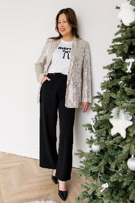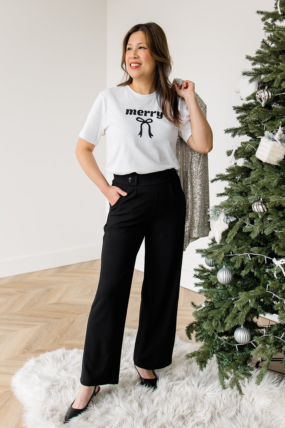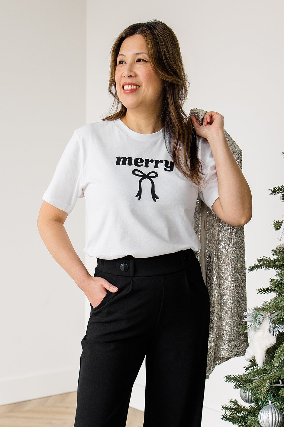 How sweet is this tee? This tee is perfect to wear through the holiday season. I love pairing this with a blazer or cardigan. This tee is the same fit as many of our past graphic tees. It is a lightweight cotton tee and is soft and comfortable. The other graphic tees that I have that are this same body and fabric have continued to wash up well and look like new. I am normally size Small and I usually prefer size Medium in this style. This is the size that I am wearing here and it fits great since I usually like to tuck this tee in. If you prefer a more oversize fit, please size up!