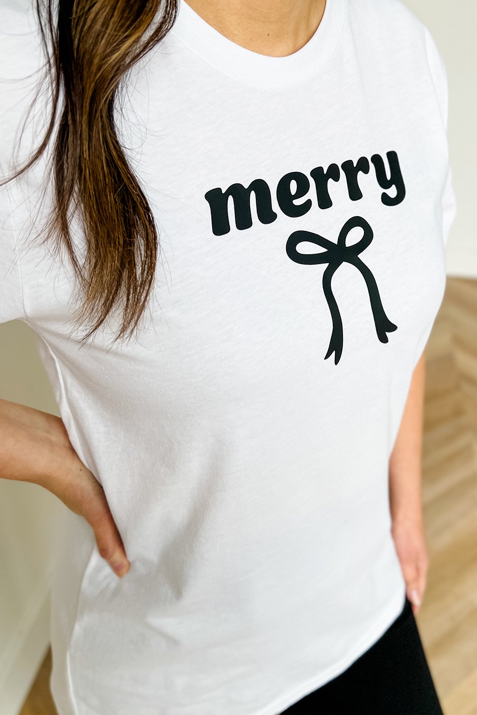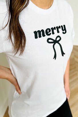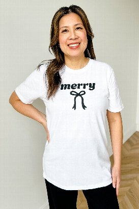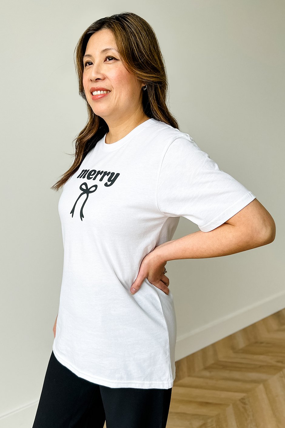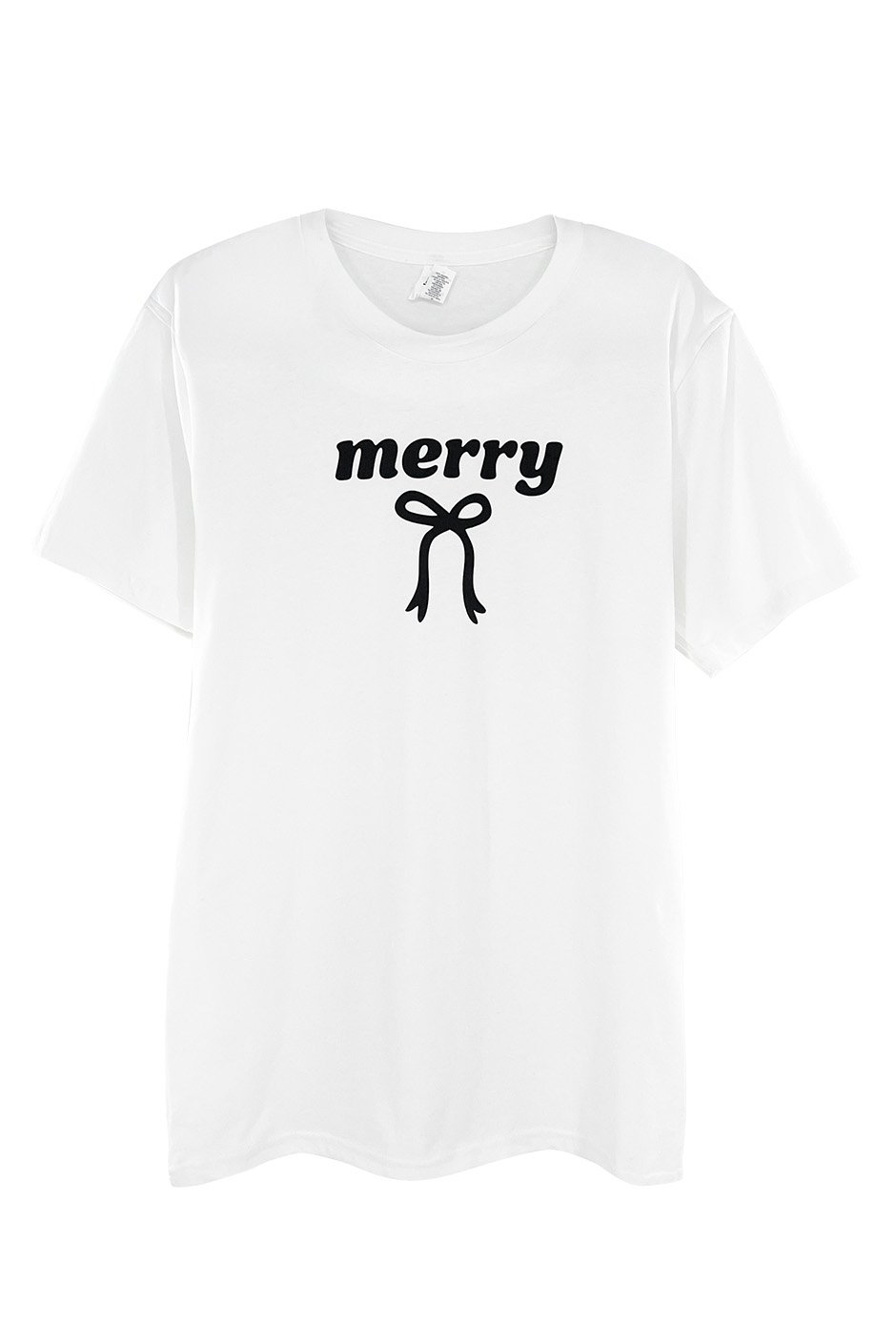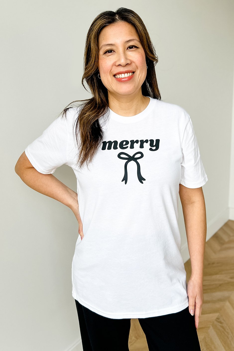 Lightweight and soft, made from 100% combed cotton, this tee keeps things cozy and easy. The “merry” graphic adds a classic holiday touch that works for cozy nights, tree decorating, or snapping seasonal photos.