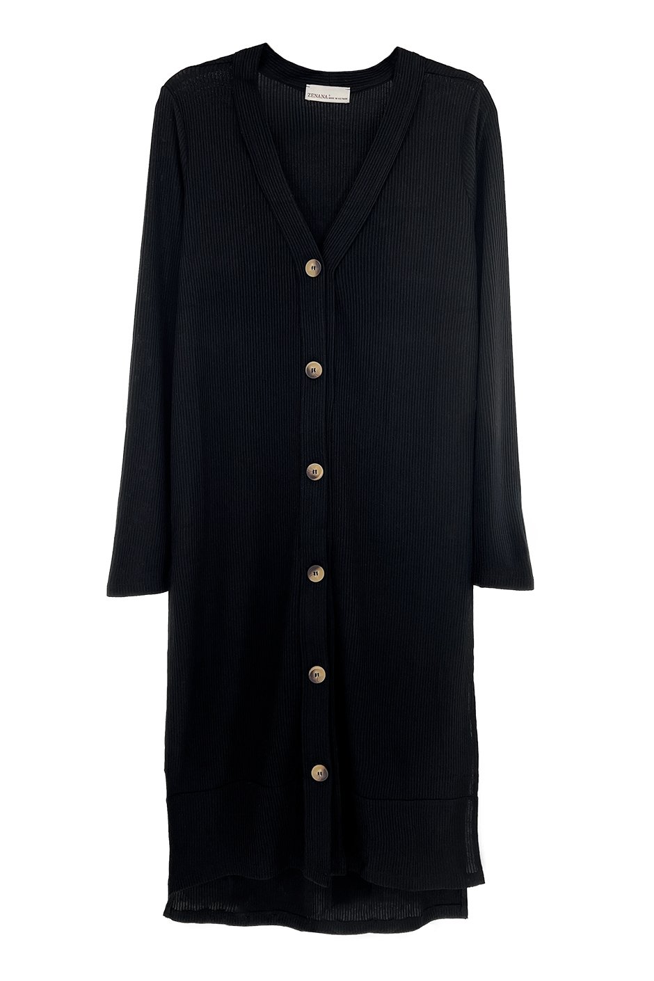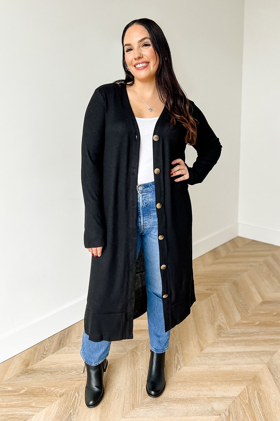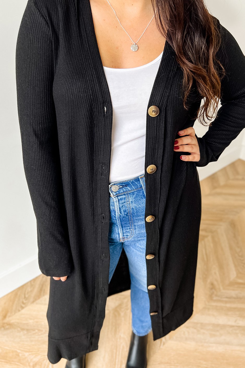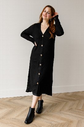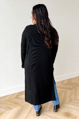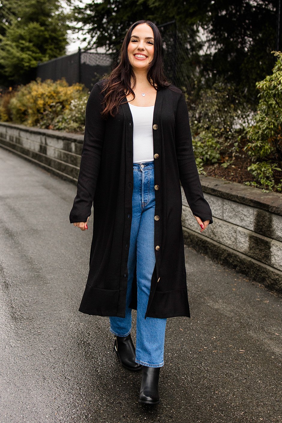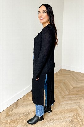 I looove the style of this cardigan. It's so easy to throw on and make any outfit look complete. I love the lightweight ribbed fabric, making it easy to wear. It's a long cardigan, so I wore it closed with a skirt to make it look more like a dress! I personally love that look! It has a slit on the sides, so it has plenty of room for movement. I'm wearing my true size small and it fits exactly how I'd like it to!