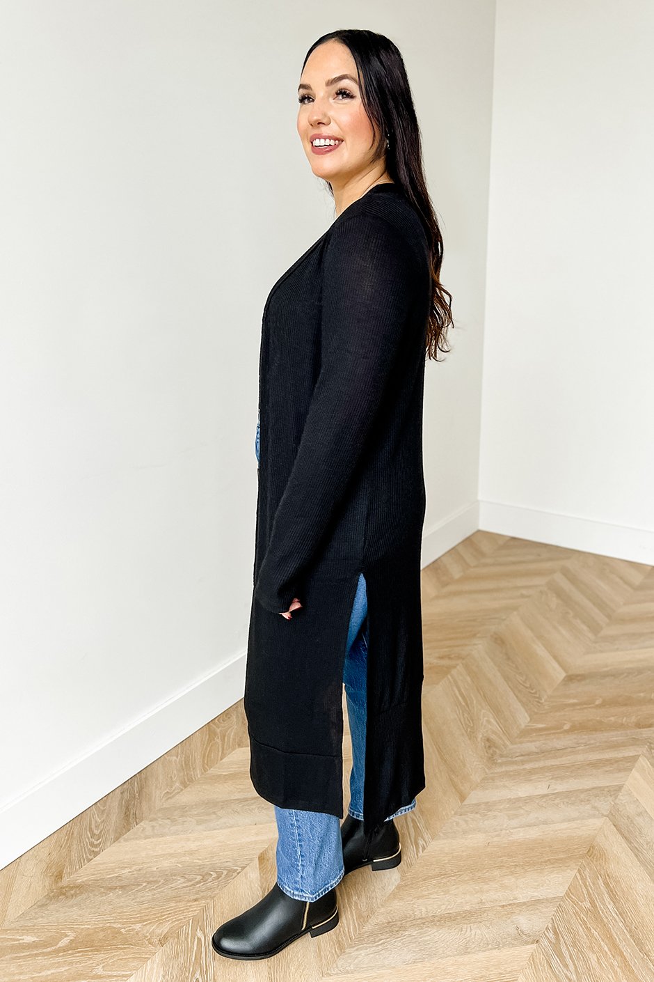 The Long Story Cardigan is made from lightweight rib fabric that's perfect for layering. The hi-low hem and side slits give it a relaxed, flowy feel, while thumbholes in the sleeves keep things cozy.