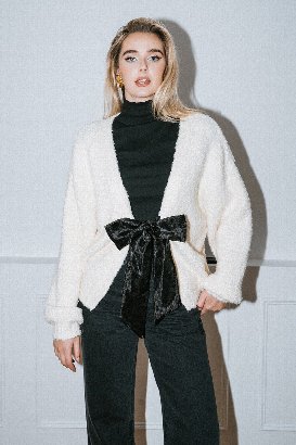 The dreamiest Brunette the Label cardigan, knit from luxuriously soft bouclé yarn and finished with an elegant organza bow that ties at the front. It’s cozy, feminine, and effortless all at once.