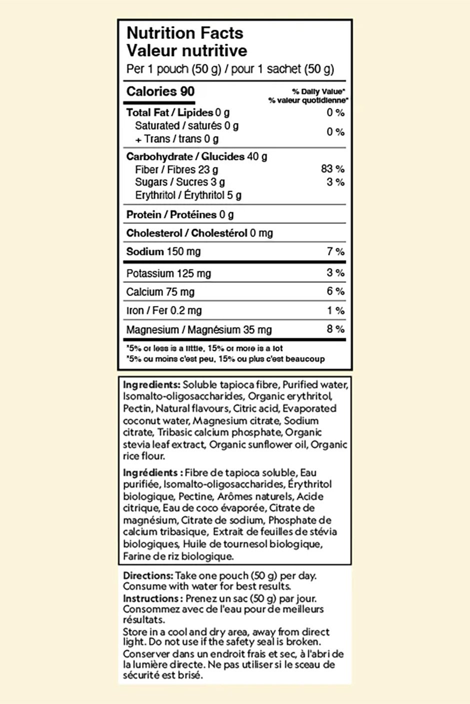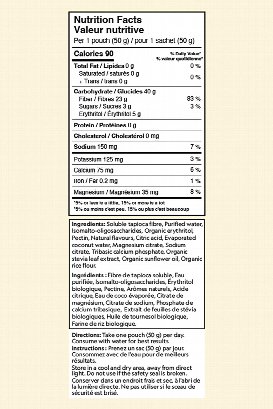 Soluble tapioca fibre, Purified water, Isomalto-oligosaccharides, Organic erythritol, Pectin, Natural flavours, Citric acid, Evaporated coconut water, Magnesium citrate, Sodium citrate, Tribasic calcium phosphate, Organic stevia leaf extract, Organic sunflower oil, Organic rice flour