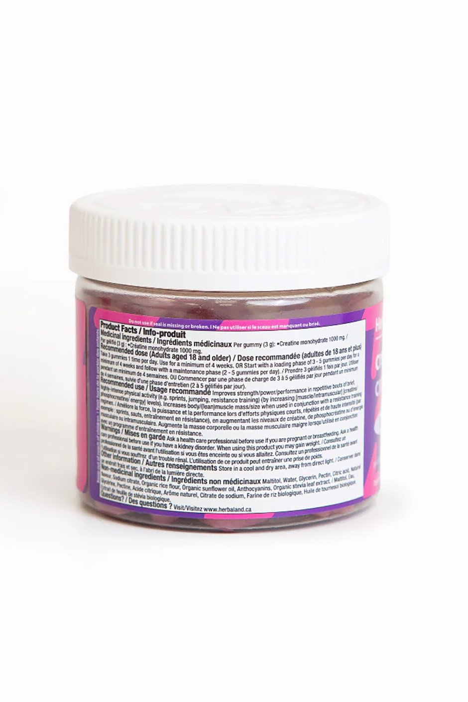 Non-medicinal ingredients: Maltitol, Water, Glycerin, Pectin, Citric acid, Natural flavour, Sodium citrate, Organic rice flour, Organic sunflower oil, Anthocyanins, Organic stevia leaf extract