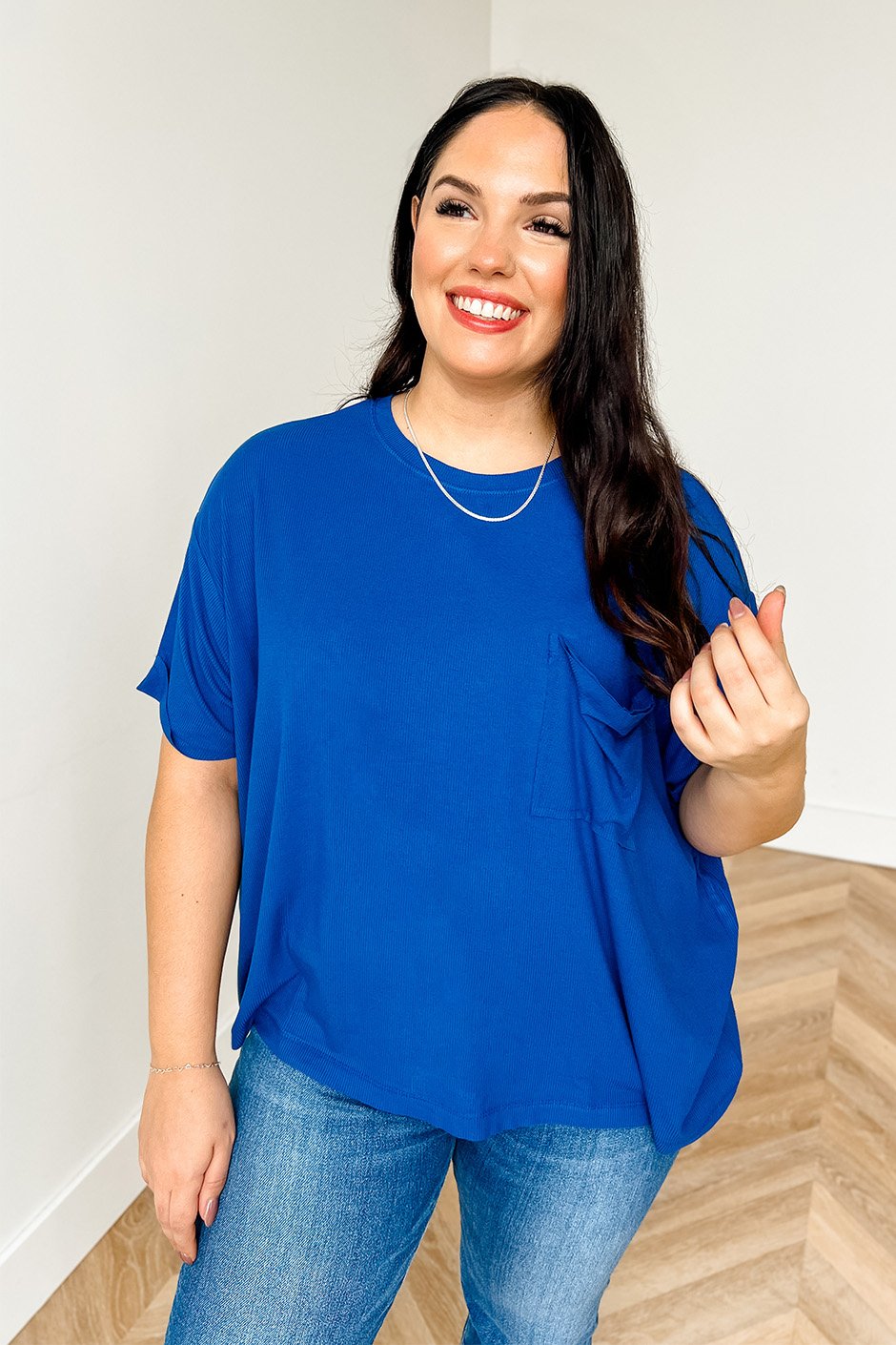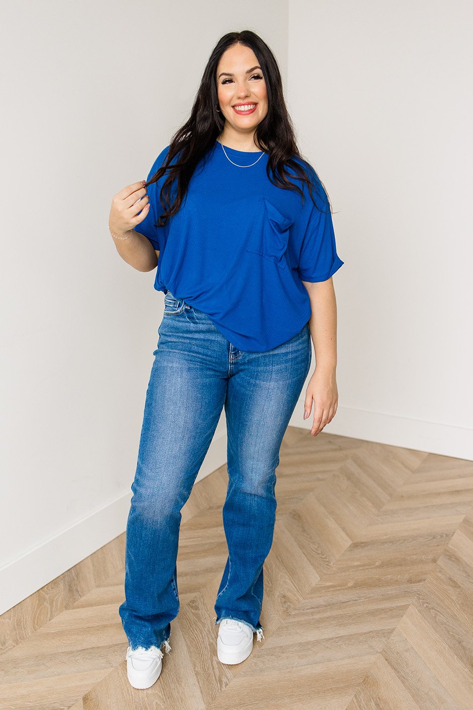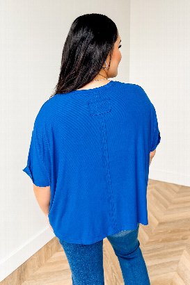 The Fine by Me Tee is oversized and made from soft, stretchy rib fabric. Raw edge details add a relaxed, undone vibe. Style it with high-waisted jeans or tuck it into joggers.