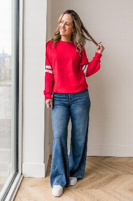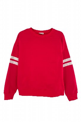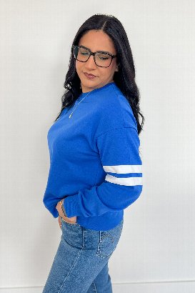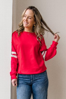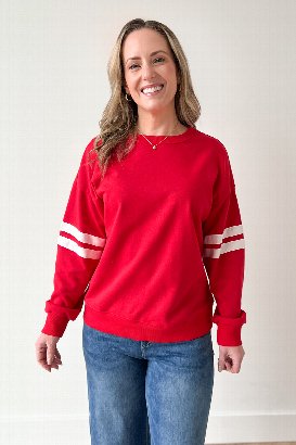 The Varsity Sweatshirt brings classic athletic vibes with stripe details on the sleeves. Dropped shoulders and ribbed cuffs give it that relaxed, sporty feel. Pair it with jeans or joggers for easy style.