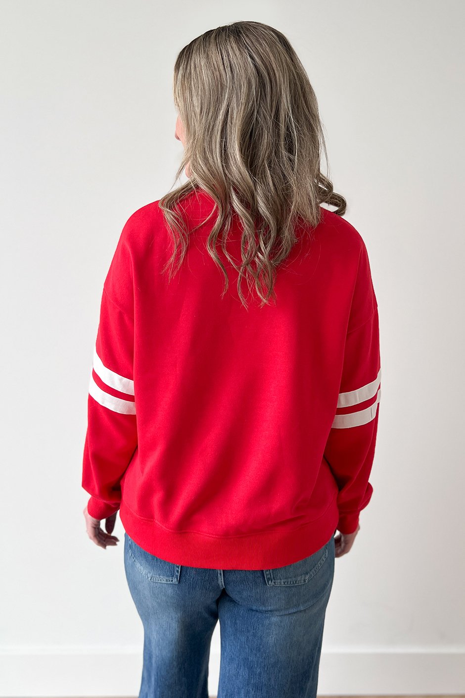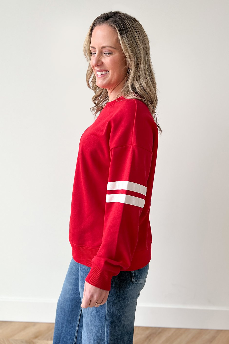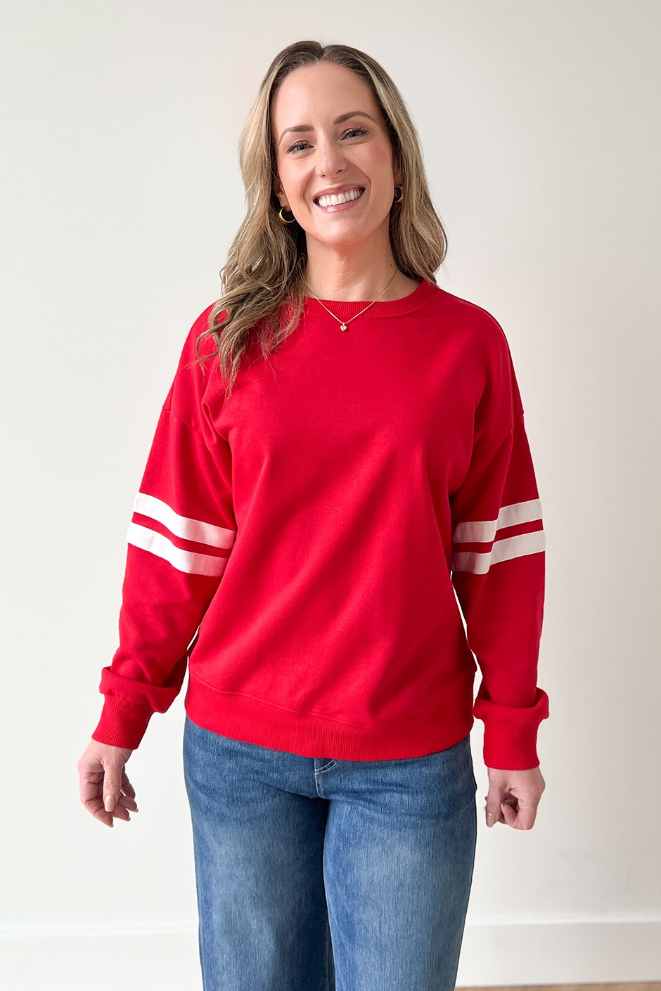 Hello, red moment! ❤️ This sweatshirt definitely caught my attention and I loved how it looked on. It has that classic round neck, dropped shoulders, and ribbed hem & cuffs, with a varsity-style stripes around the sleeves (which I love). The fit is true to size (I’m wearing my usual size small), it's in that perfect in-between zone: relaxed and comfy without being oversized or tight. Gotta love Salti!